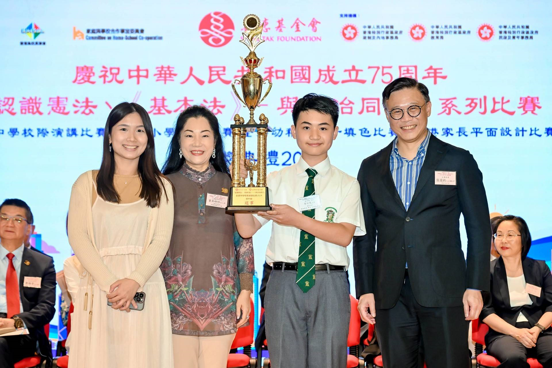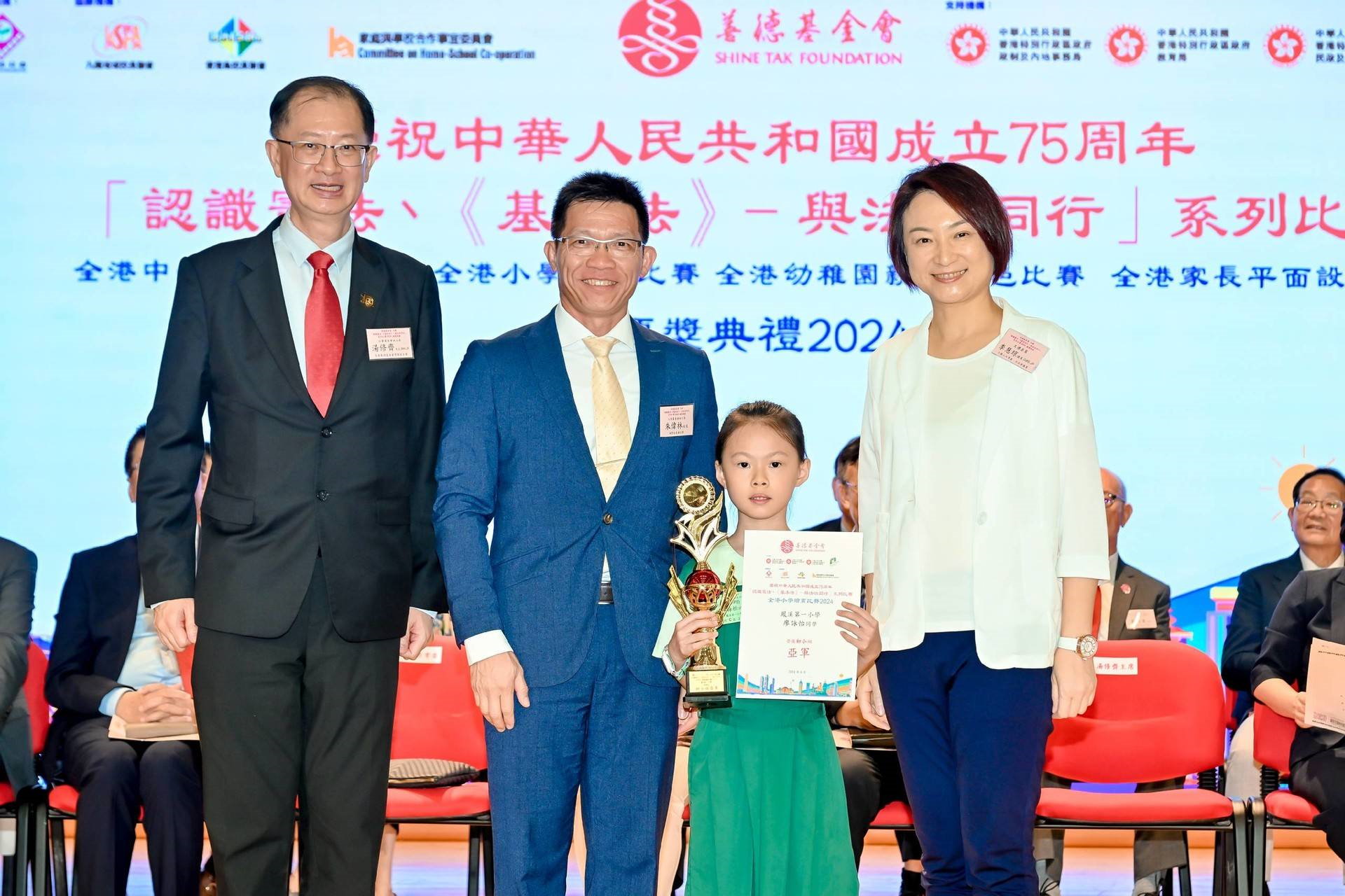 由香港善德基金會主辦,新界校長會統籌、九龍地域校長聯會、香港島校長聯會及家庭與學校合作事宜委員會協辦,政制及內地事務局、教育局及民政及青年事務局支持的「認識憲法、基本法—與法治同行」系列比賽於今年2月至5月舉行,並於今日(22日)舉行頒奬典禮。典禮獲律政司副司長張國鈞、全國人大常委會委員李慧琼、中聯辦法律部副部長張玉梅、中聯辦新界工作部副部長李功勛、政制及內地事務局副局長胡健民、教育局總課程發展主任(公民與社會發展)江紹卓擔任主禮嘉賓,並得到全國人大常委會香港基本法委員會副主任黃玉山、港區全國人大代表陳振彬、港區全國人大代表召集人/立法會議員陳勇、立法會議員容海恩、黃錦輝、周文港及郭玲麗出席支持和頒獎。