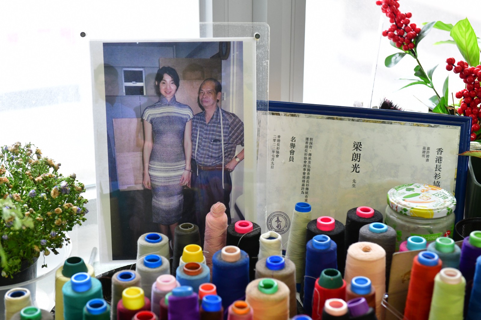 與梁師傅初次見面,在他位於觀塘的朗光時裝工作室,這位謙遜低調的老裁縫正在工作台上忙碌着,牆上掛滿王家衛電影《花樣年華》的劇照。距離電影上映已過去24年,張曼玉在戲中的旗袍造型至今仍然是很多觀眾心目中不過時的經典。在電影中出現的旗袍,就是出自梁師傅之手。他入行70多年,自1998年與電影製作團隊結緣後,一直潛心鑽研旗袍這門手藝。「我用了兩年時間為《花樣年華》一共做了30多件旗袍,最終呈現的有23套,全是美術指導張叔平設計後找我製作的。」從度身、試身,到旗袍成型後還需要根據穿着者的身材進一步修改,最終完成一件旗袍至少要半個月時間。對於那段影響他人生的經歷,梁師傅記憶猶新:「為方便製作旗袍,我到片場給張曼玉試身改衣,還與工作人員一起吃盒飯。」