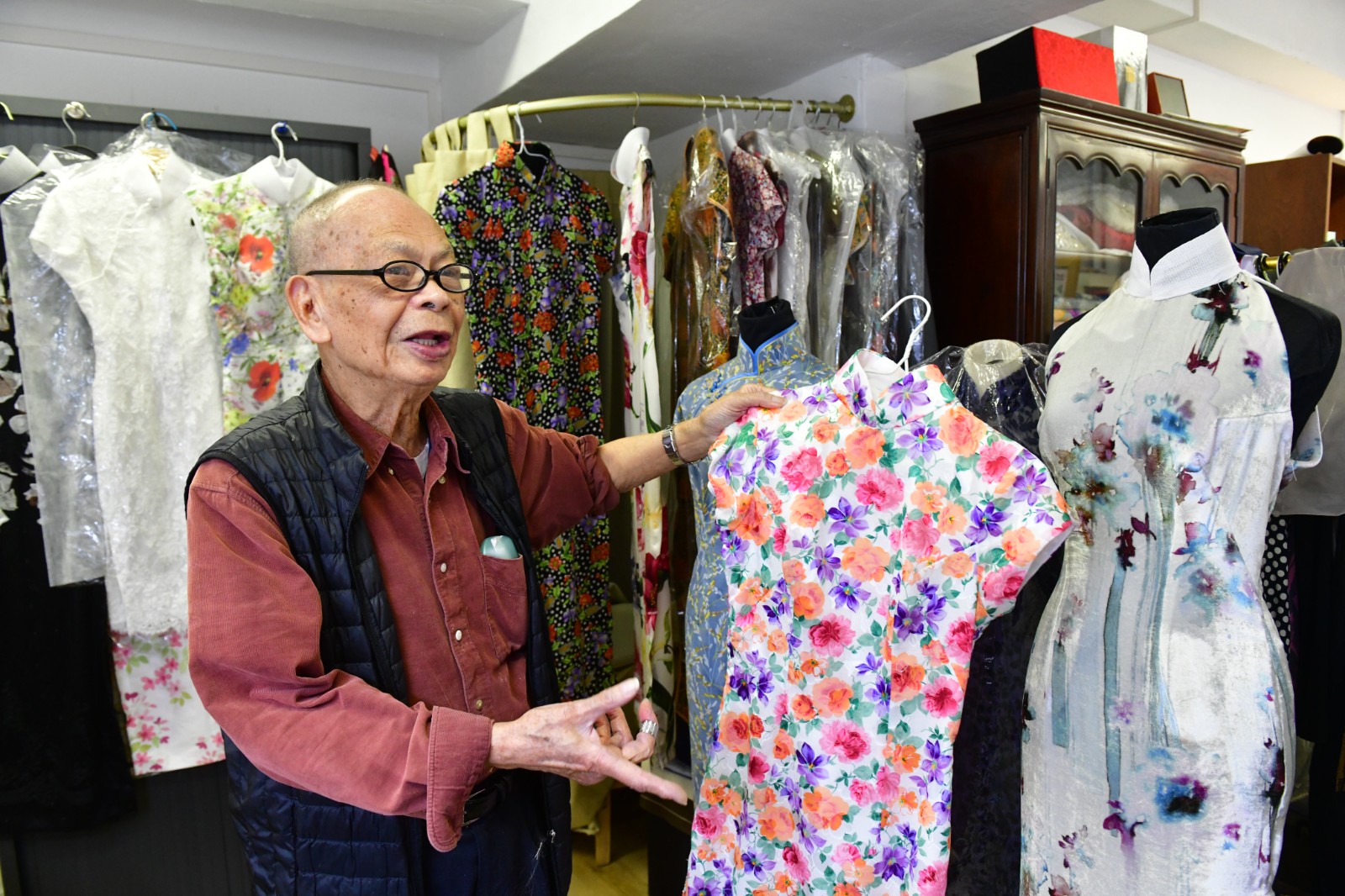 殷家萬從事旗袍裁縫工作超過半世紀,如今年過80﹐依然每日埋首車衣間工作。
