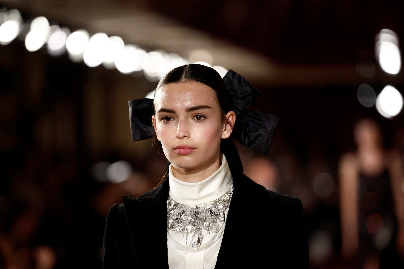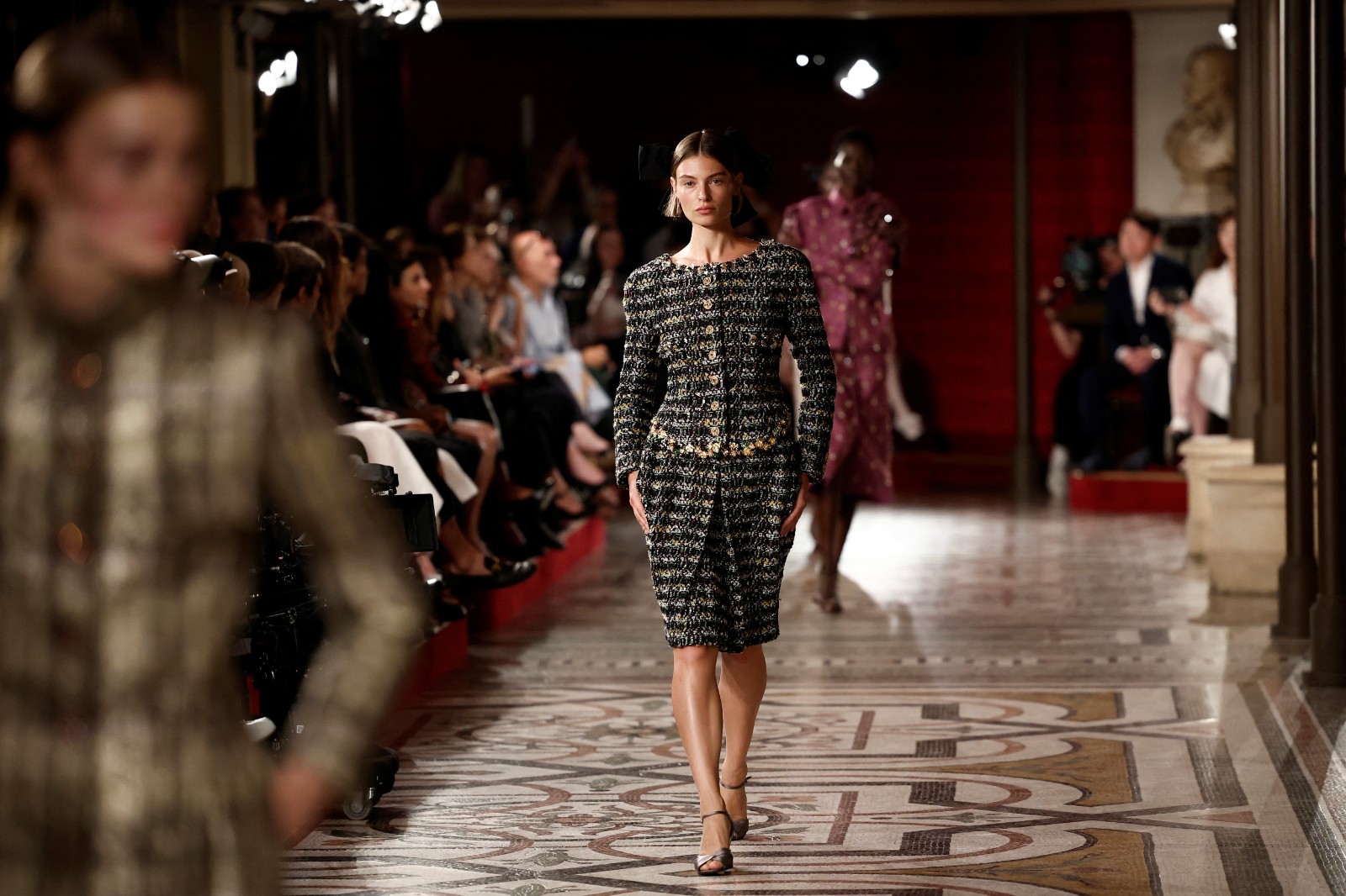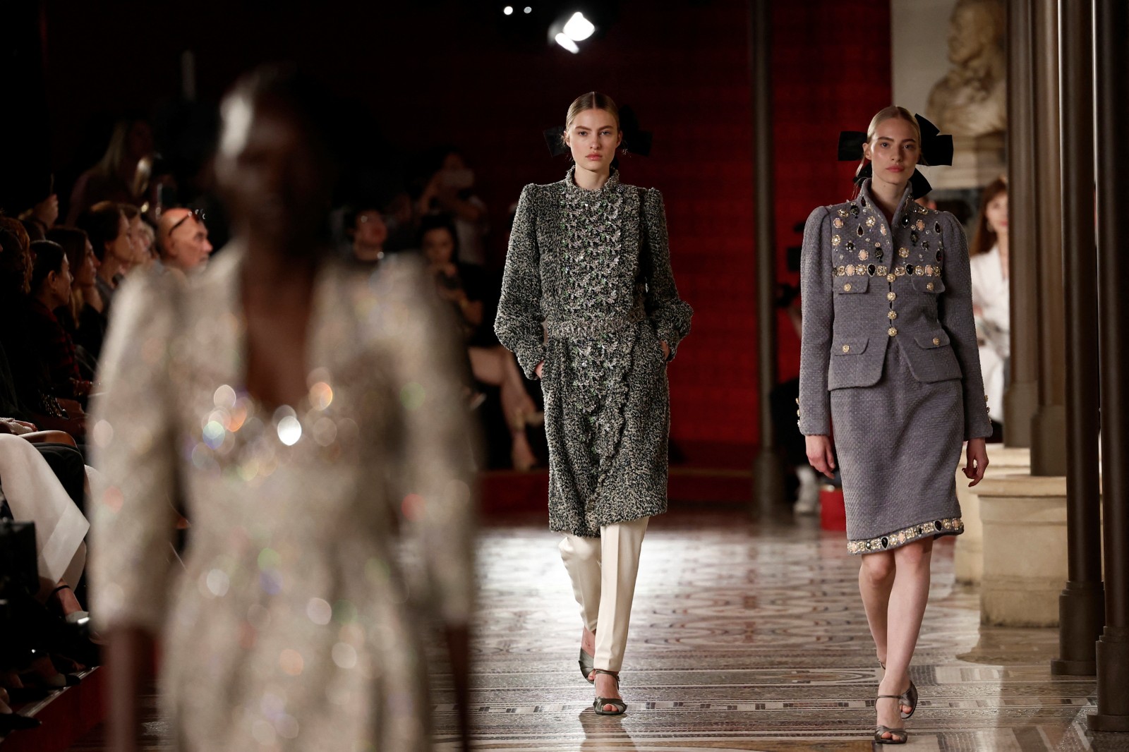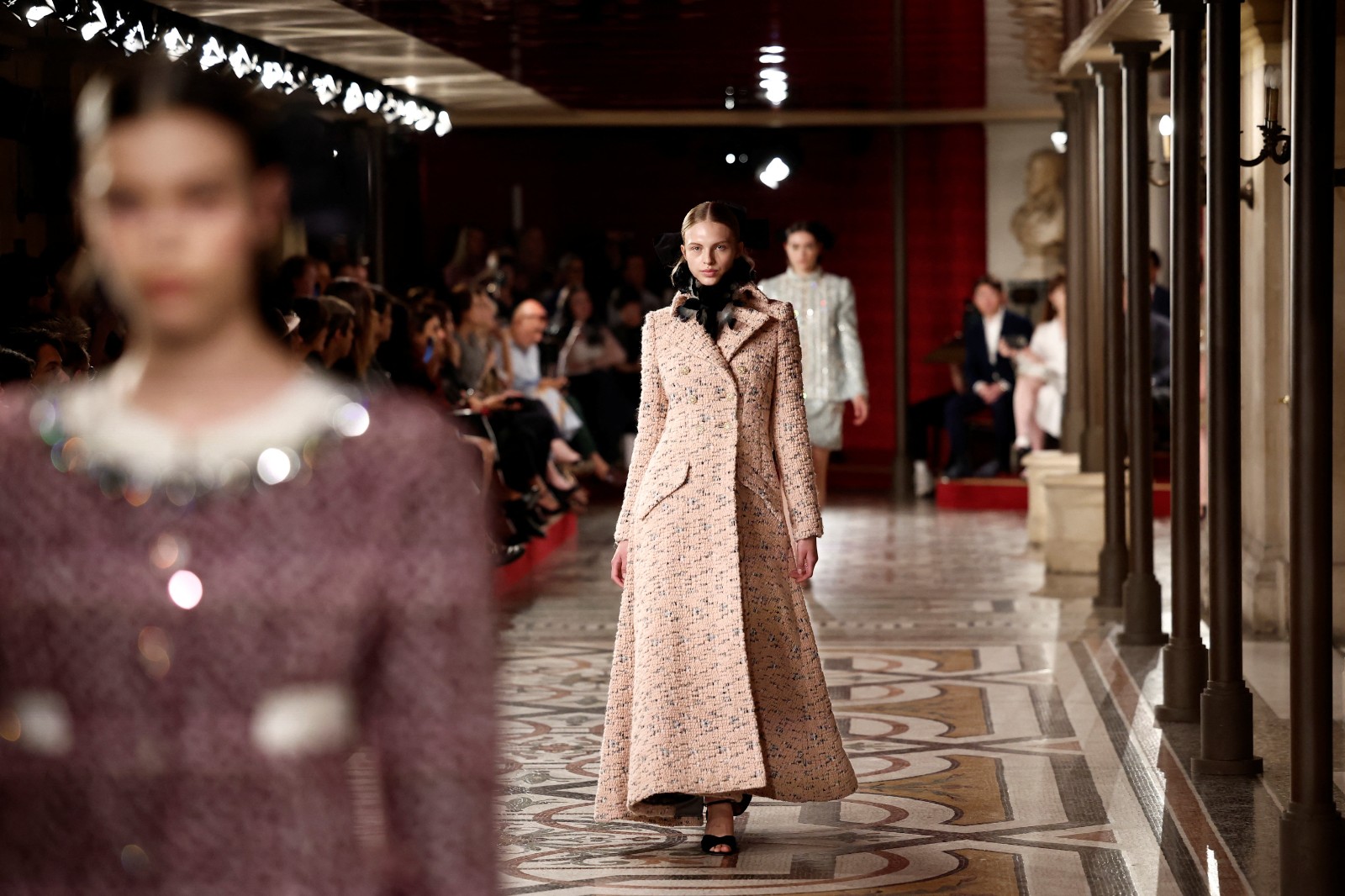 當地時間25日,Chanel的2024年秋冬高級訂製系列在巴黎歌劇院Palais Garnier舉行。該系列具有令人驚艷的設計元素,例如羽毛袖和拖地披肩。設計重新詮釋了經典的Chanel元素,包括用白色緞帶修飾的酒紅色斜紋套裝、黑色燈芯絨燕尾服和刺繡白色襯衫。長外套、寬大披肩和晚禮服完美呈現了現代化的舞台傳統。(圖源:路透社)