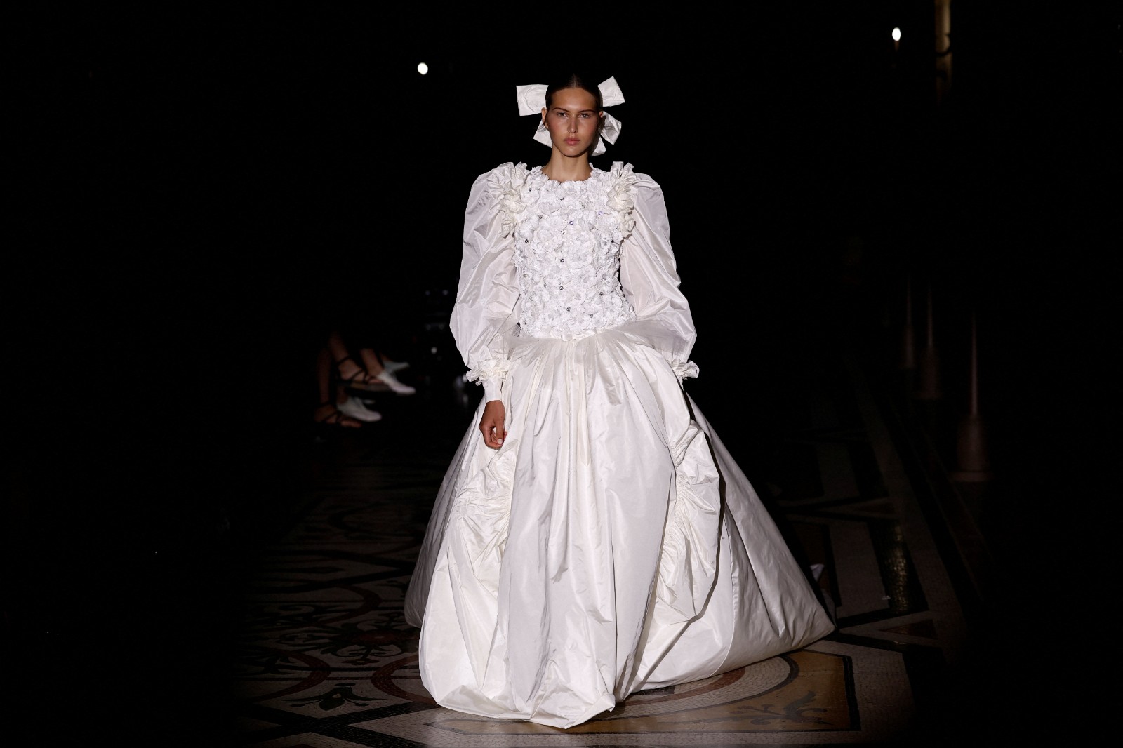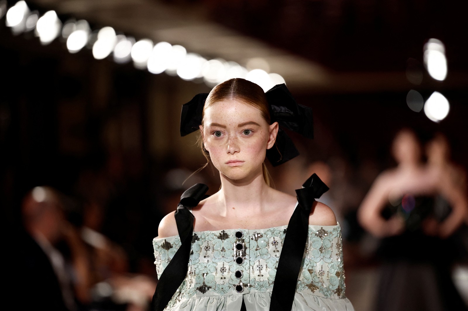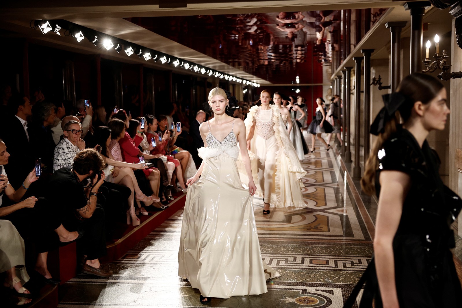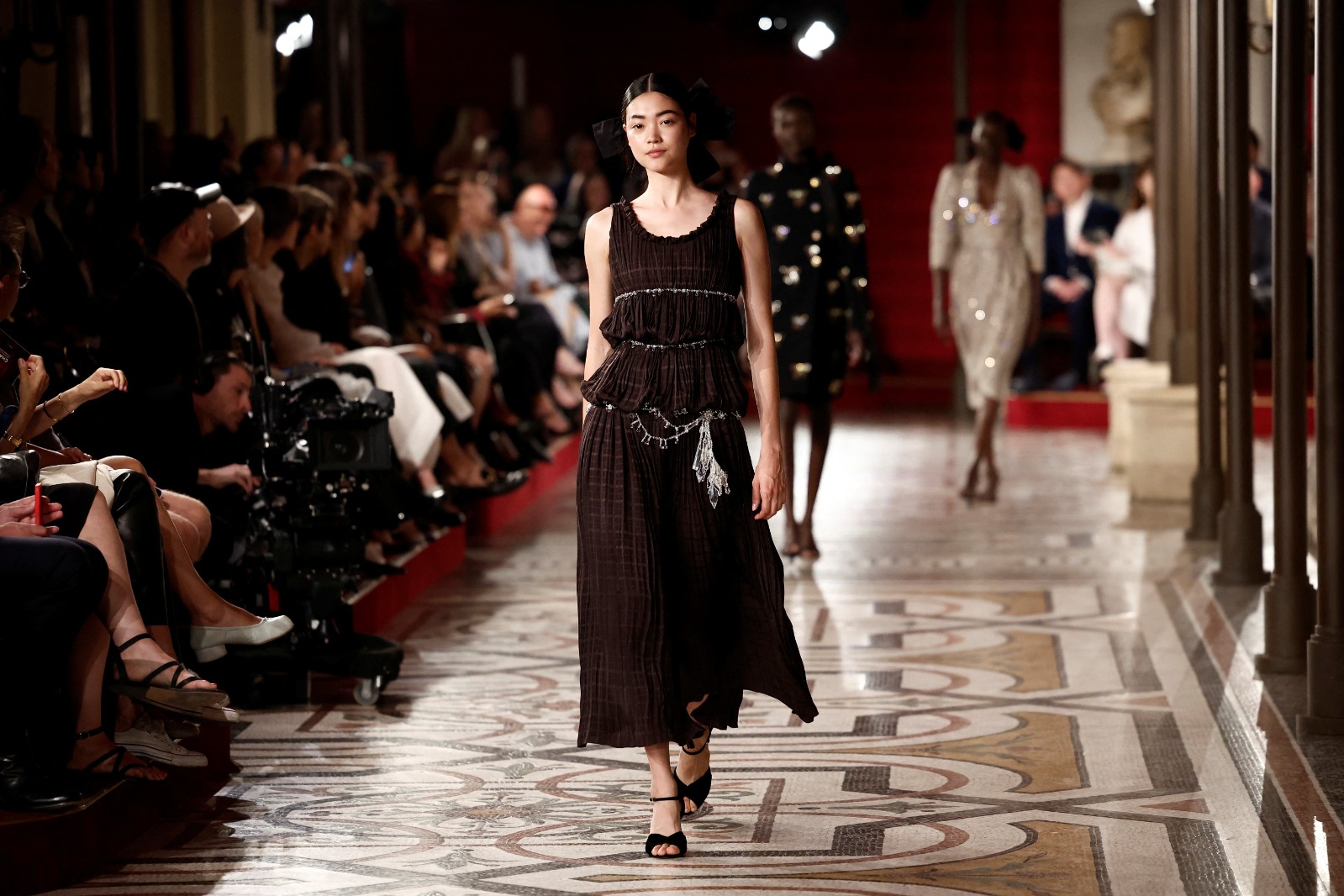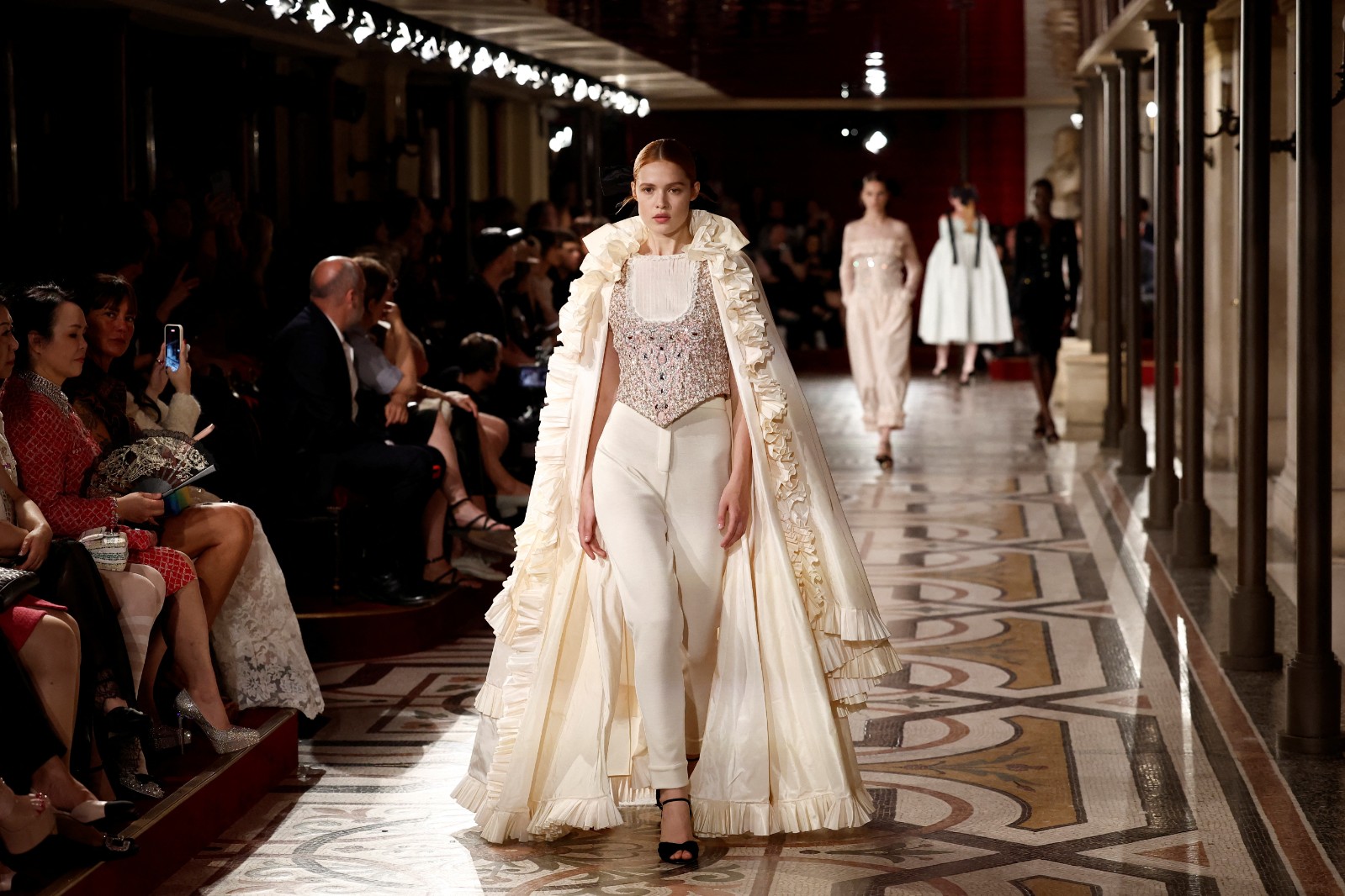 當地時間25日,Chanel的2024年秋冬高級訂製系列在巴黎歌劇院Palais Garnier舉行。該系列具有令人驚艷的設計元素,例如羽毛袖和拖地披肩。設計重新詮釋了經典的Chanel元素,包括用白色緞帶修飾的酒紅色斜紋套裝、黑色燈芯絨燕尾服和刺繡白色襯衫。長外套、寬大披肩和晚禮服完美呈現了現代化的舞台傳統。(圖源:路透社)