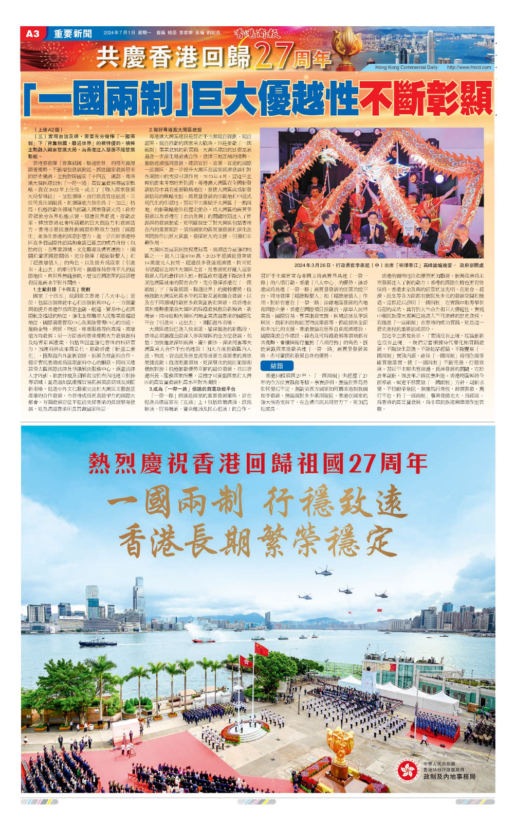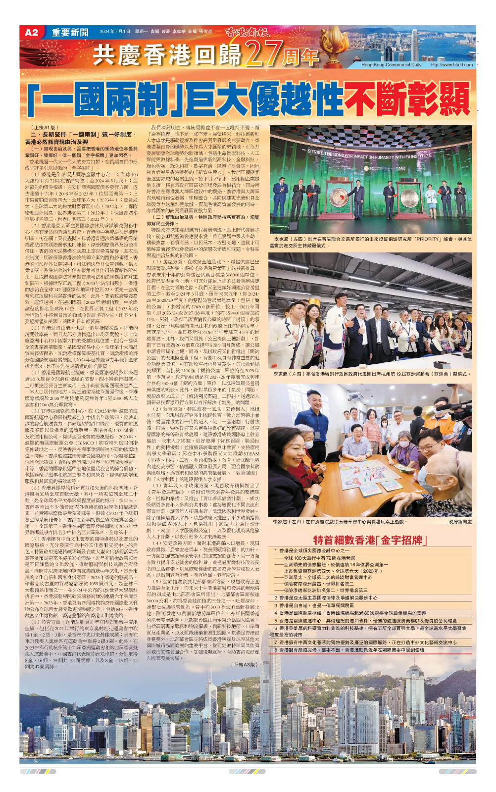 繼前年和去年七一為香港商報獨家撰文後,行政長官李家超今年又給香港商報讀者和受眾發來近萬言專文《香港回歸以來「一國兩制」實踐取得舉世矚目的重大成就「一國兩制」 巨大優越性不斷彰顯》,指出「一國兩制」是前無古人的偉大創舉,具有強大生命力和巨大優越性,強調長期堅持「一國兩制」這一好制度,香港必然能夠實現由治及興。香港商報7月1日從A1至A3版以3個版刊出。