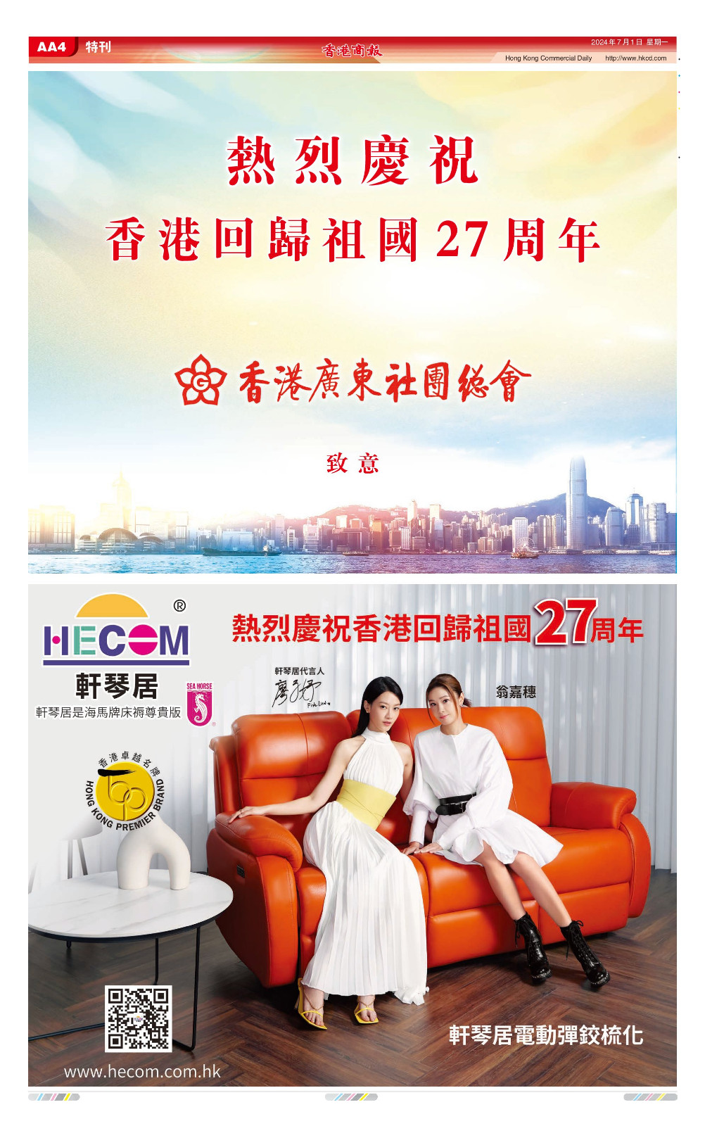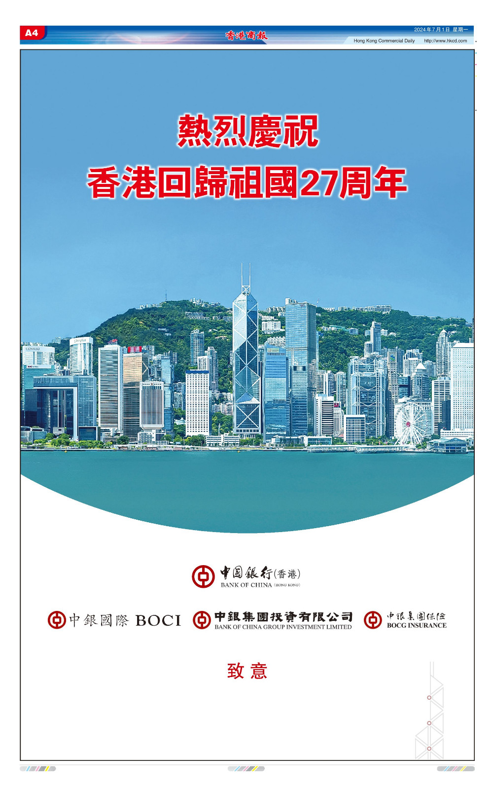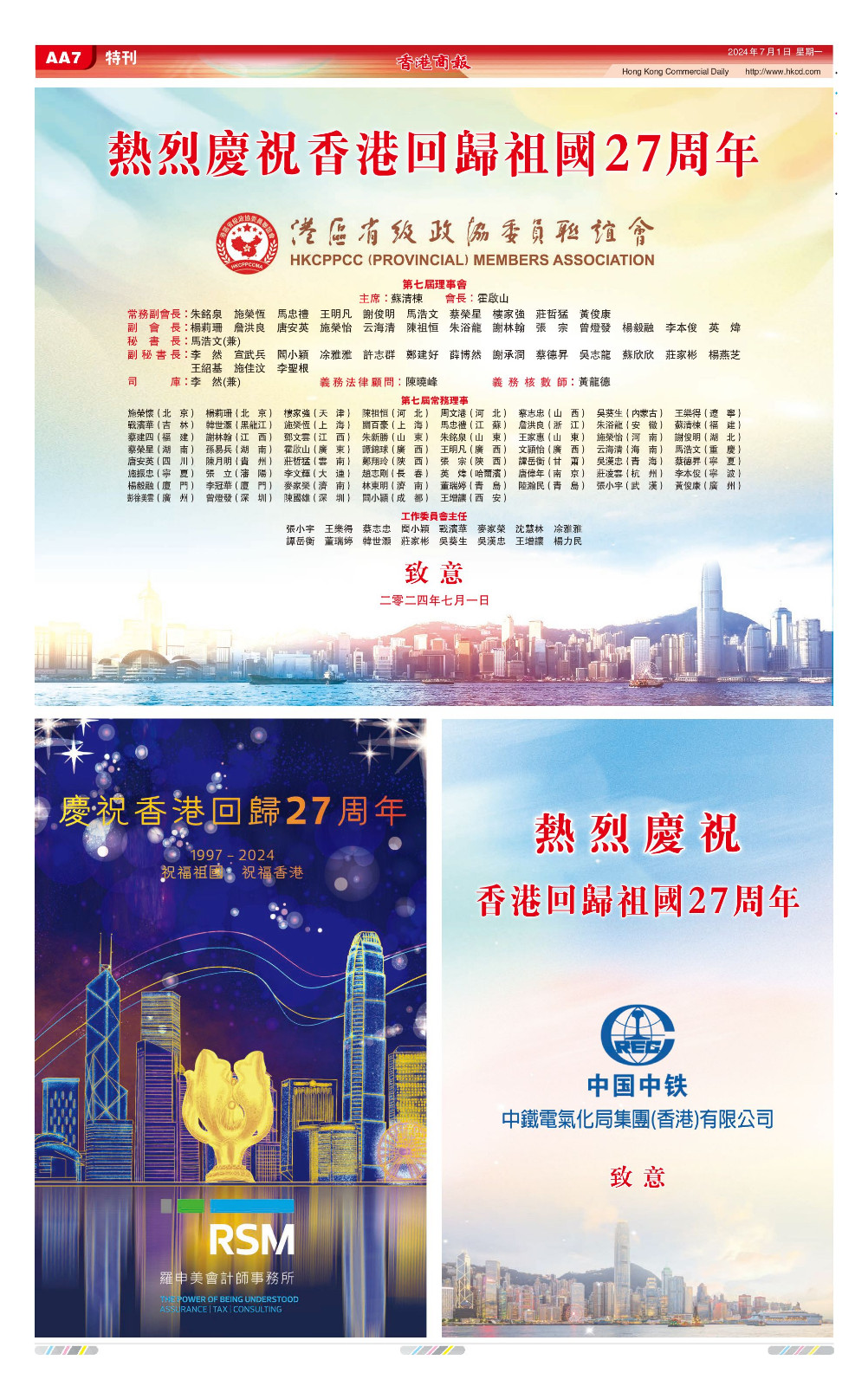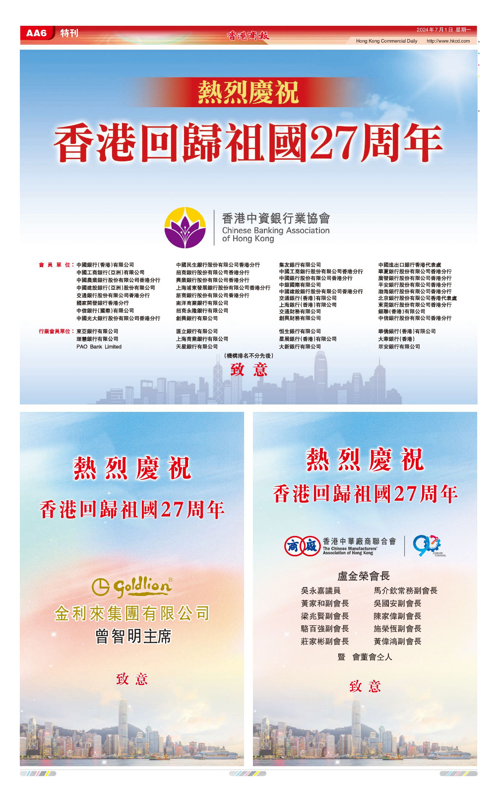 另外值得一提的是,香港商報在7月1日當天推出數十個版面,來自香港各行各業的企業、社團紛紛登報,慶祝香港回歸祖國27周年。