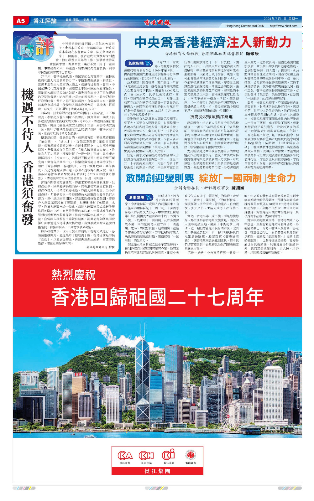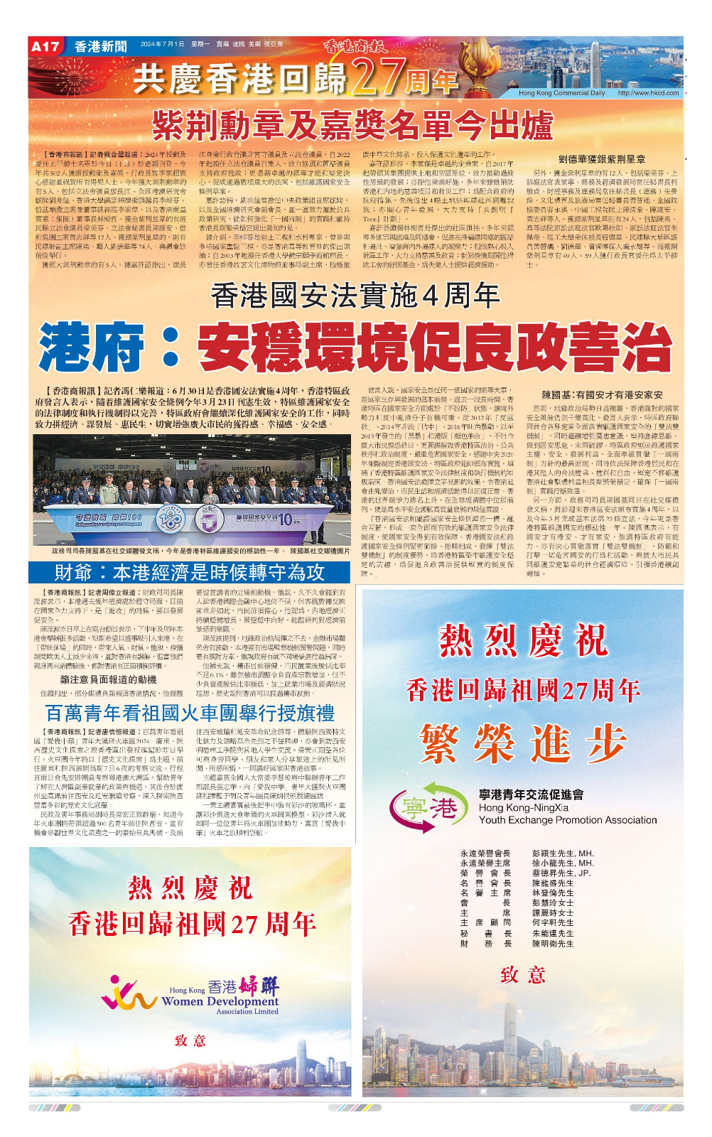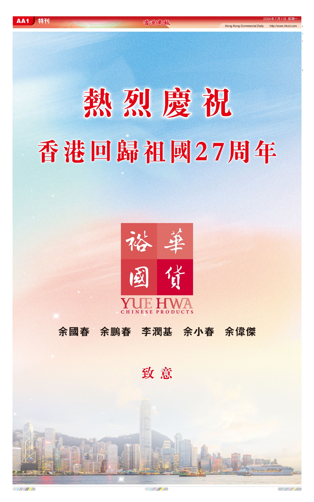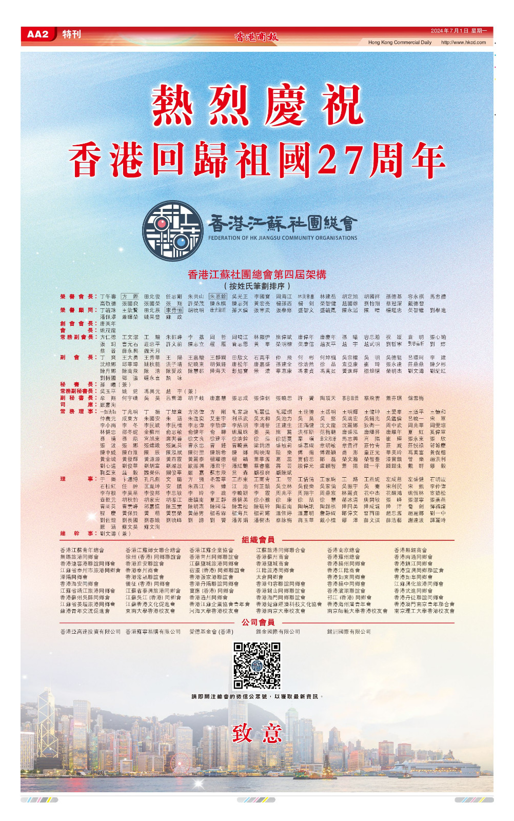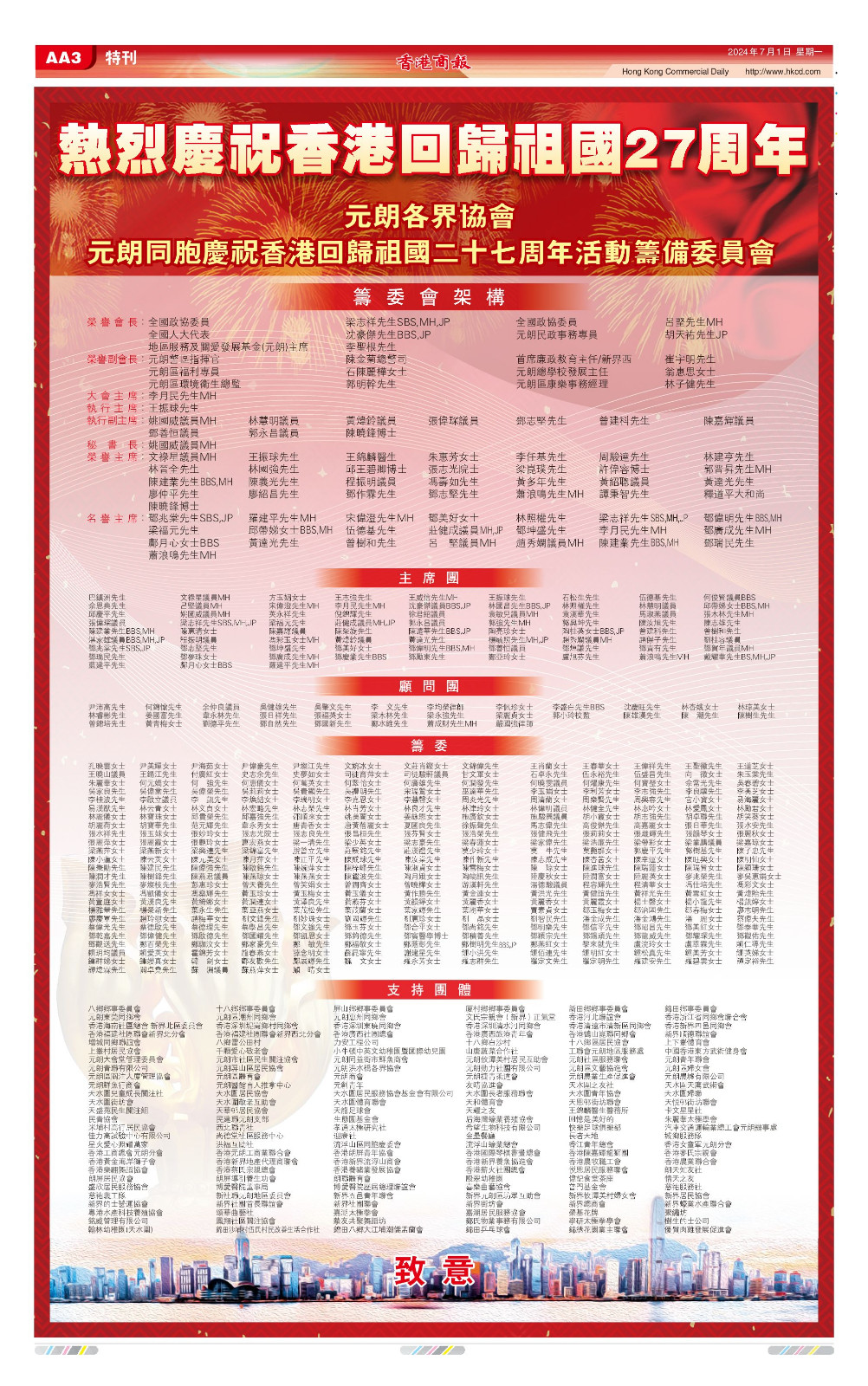 另外值得一提的是,香港商報在7月1日當天推出數十個版面,來自香港各行各業的企業、社團紛紛登報,慶祝香港回歸祖國27周年。