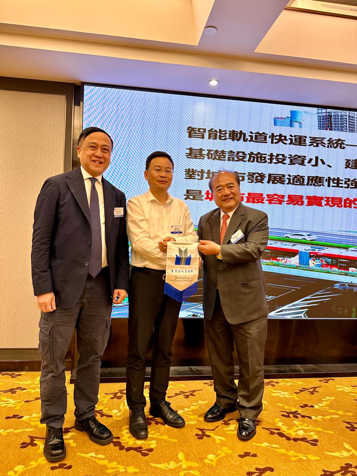香港房地產協會20日假香港中華總商會舉辦「了解國家創新科技發展──中車智軌」午餐會活動,並邀請到中國中車團隊代表擔任主講嘉賓。香港房地產協會會長郭海生、執行委員會副主席葉少明、副會長兼商務發展委員會主席羅志豪、副會長兼華東分域主席施家殷、副會長兼青俊委員會主席宋樹鴻等首長,以及立法會議員 陳恒鑌、劉國勳、顏汶羽、邱達根,區議員張景勛、林博蒞臨,與現場近70名會友共聚一堂,共同研探「智能軌道快運系統」前沿資訊,了解國家戰略性新興產業的最新動態。