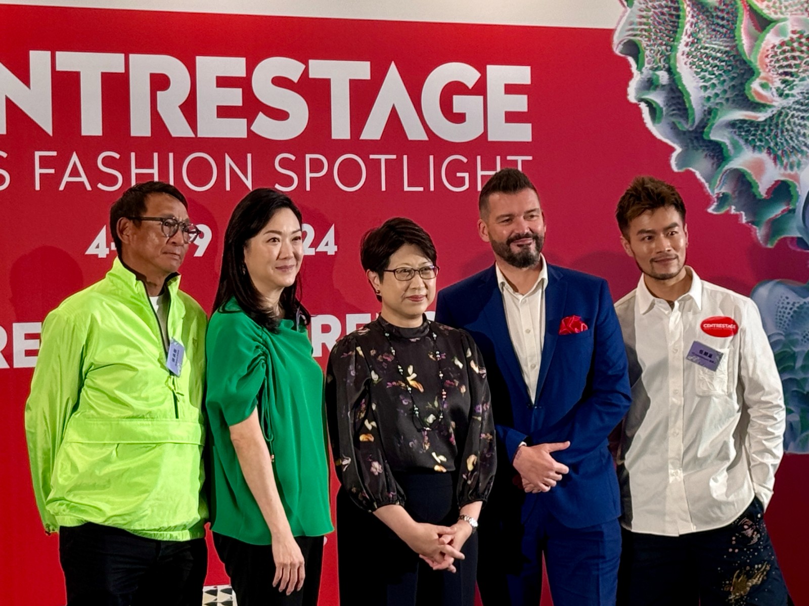 香港貿發局副總裁張淑芬(中)、香港貿發局成衣業諮詢委員會主席方淑君(左二)和英國駐香港總領事館總裁韋嘉廉(右二)、雅獅威(Ashworth)品牌總監傅承蔭(左一)及112 mountainyam創辦人任朗呈(右一)分別於CENTRESTAGE新聞發布會分享展會精彩內容、循環時尚及運動時尚趨勢。