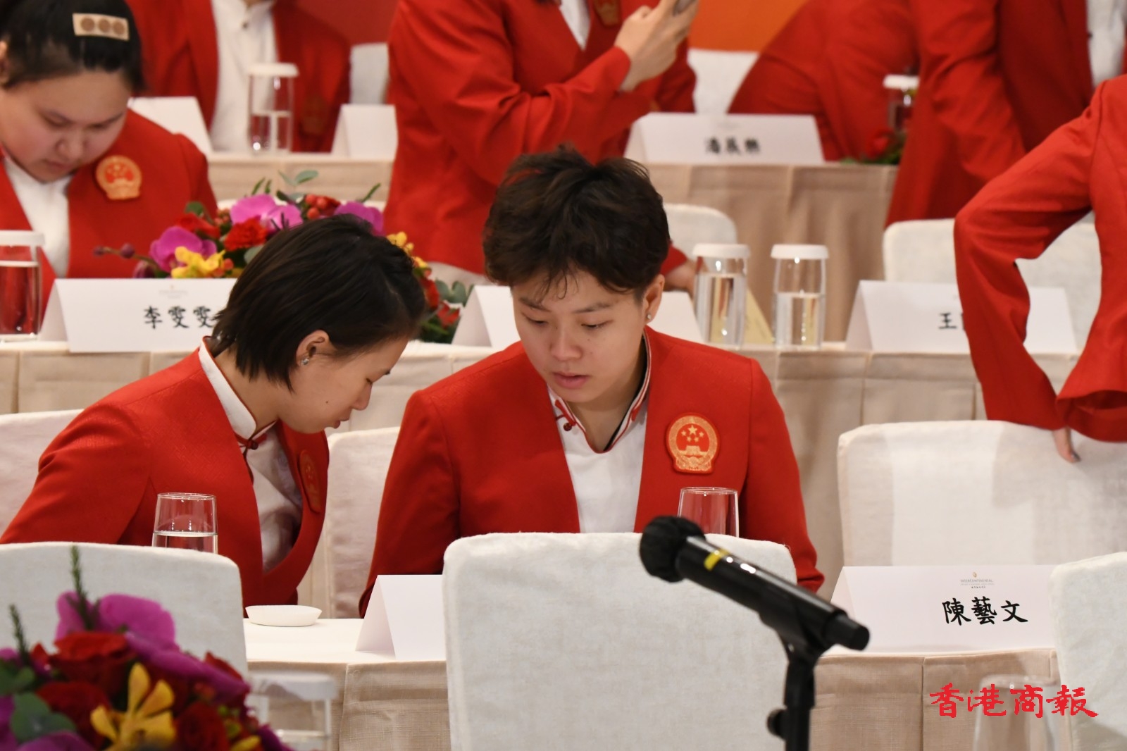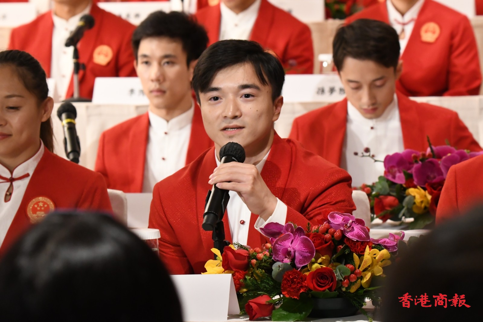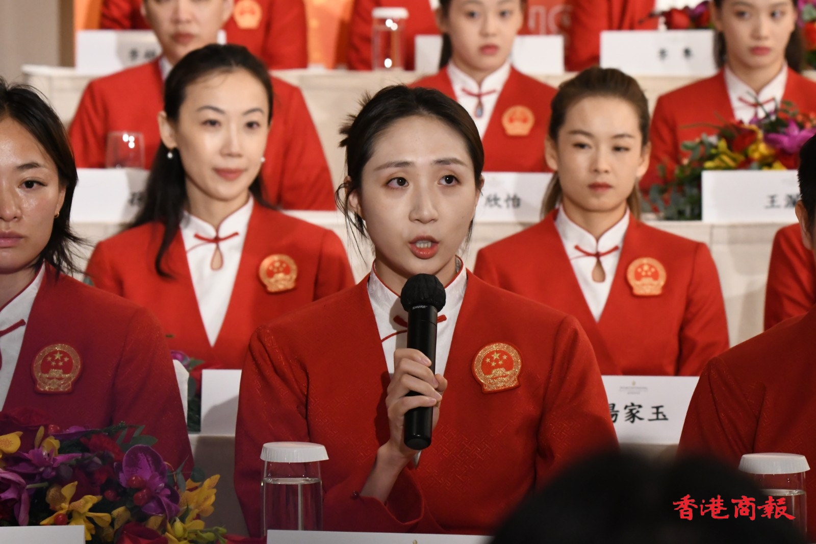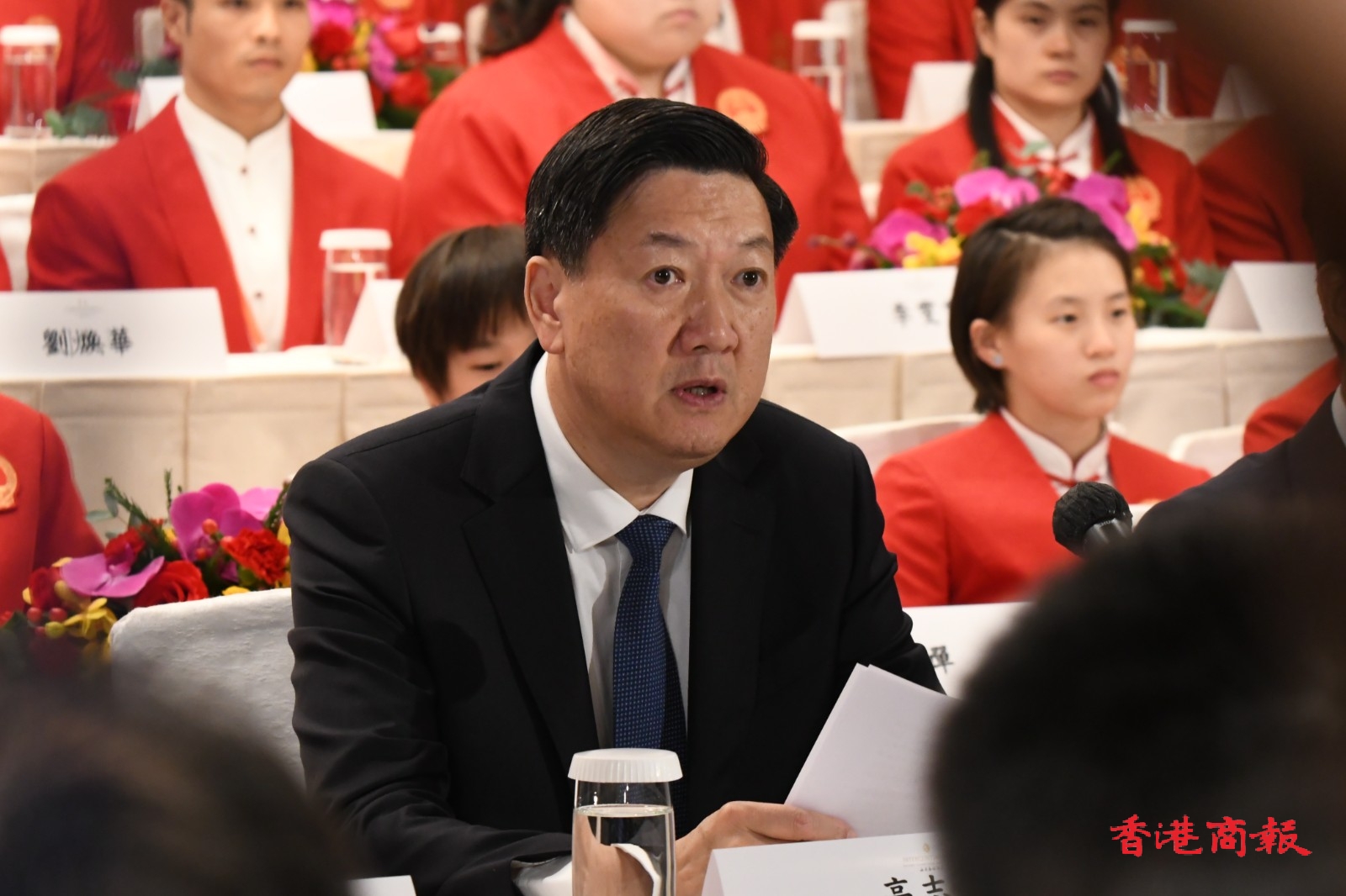 代表團團長兼國家體育總局局長高志丹表示,代表團共有65名運動員,其中金牌運動員59人,除了在美國參賽的網球運動員鄭欽文,其他悉數來港,還有6名未獲金牌但同樣表現出色,備受港澳民眾,特別是青少年關注和喜愛的優秀運動員。他表示,未來幾日全體健兒將通過參加系列活動,交流拼搏奮進的歷程,傳遞中華體育精神,暢敘家國情懷,回報香港同胞支持,共享中華民族榮耀。(拍攝:記者 馮瀚文)
