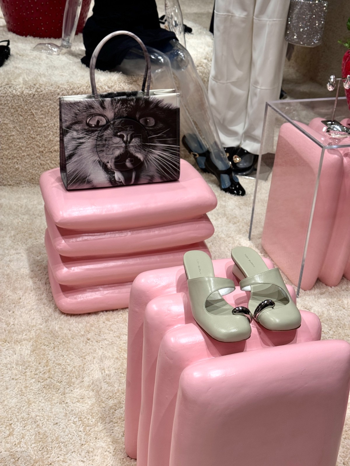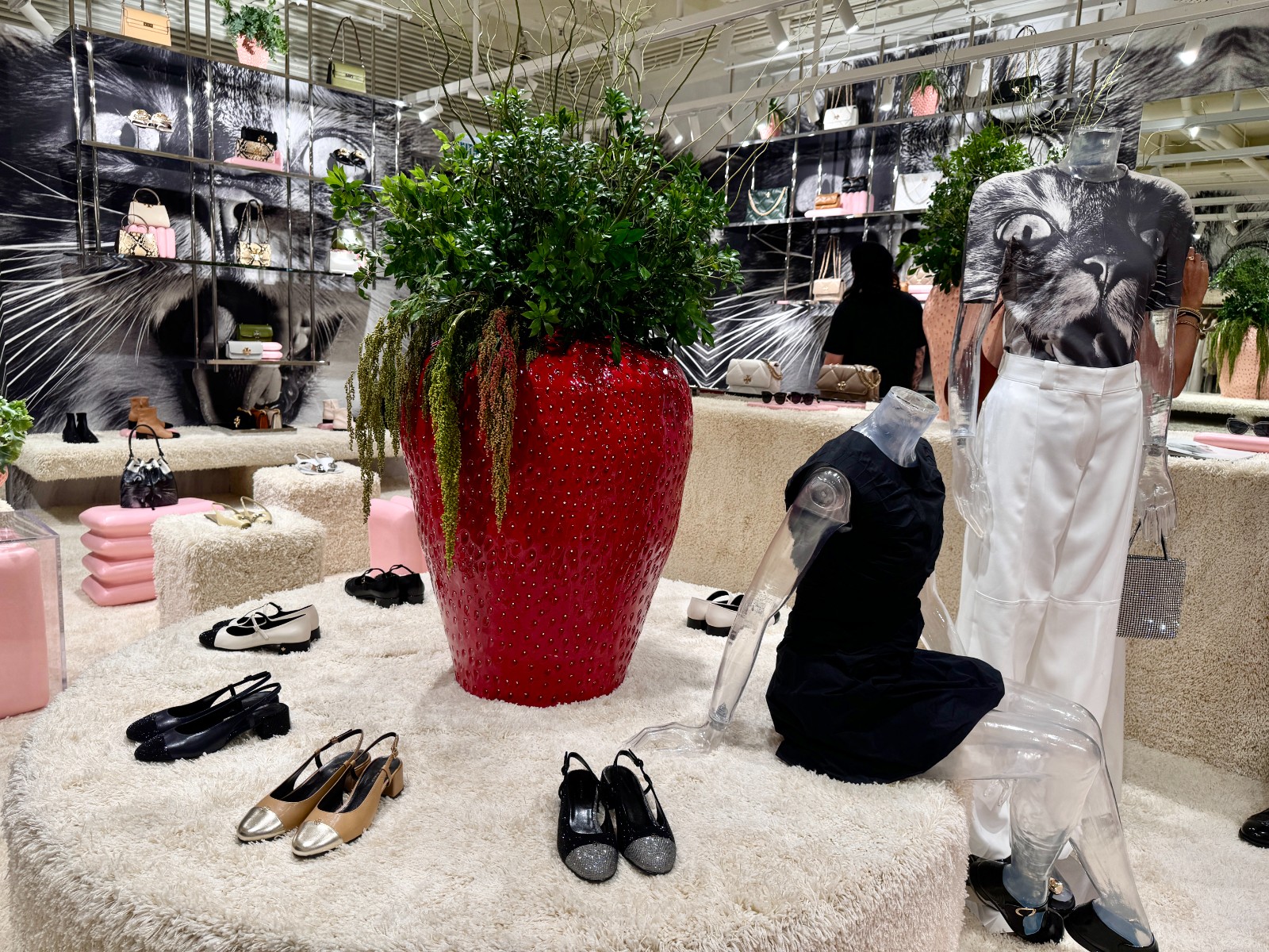 店內的牆壁和試身室的布簾反覆出現貓咪影象,粗絨地氈覆蓋着地板、壁架、腳踏凳和陳列台,使整個空間看似貓爬架般充滿趣味。此外,Humberto Leon 還委託了墨西哥 Chuch Estudio 工作室的藝術家 Aranza Garcia 創作了一系列粉紅色陶瓷底座,展示限量別注系列及品牌秋季系列的款式。