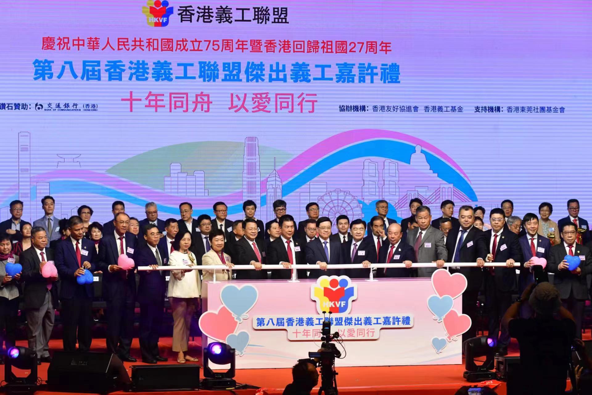 第八屆香港義工聯盟傑出義工嘉許禮今午(7日)在灣仔伊利沙伯體育館舉行,吸引逾百人出席。適逢香港義工聯盟成立10周年,今年主題為「十年同舟,以愛同行」,行政長官李家超、民政及青年事務局局長麥美娟擔任主禮嘉賓。李家超致辭時表示,會場氣氛熱烈,座無虛席,正正展現義工們的熱誠澎湃和團結一致,他恭賀得獎的團體和義工,讚揚他們積極投入義務工作,貢獻社會,絕對值得嘉許。