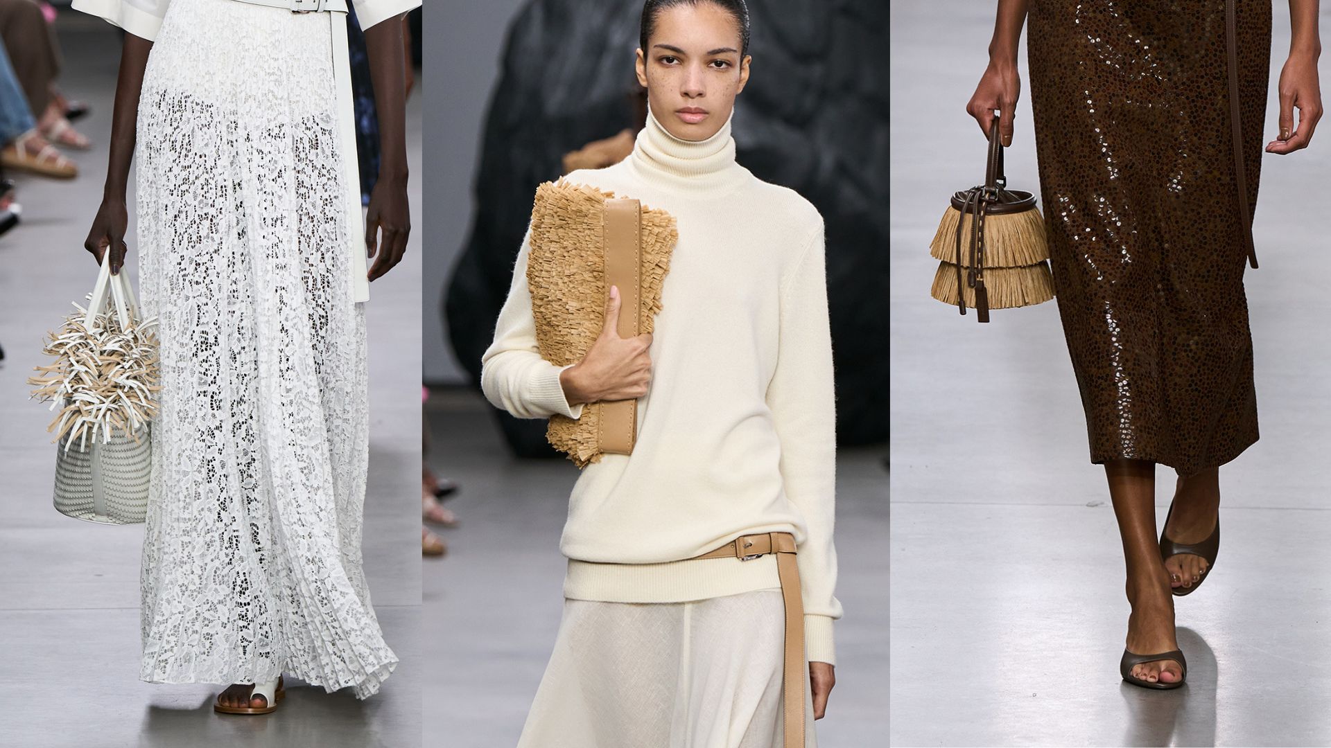 春夏系列的色彩選擇也十分考究,以黑白為基礎色調,搭配大地色系的朱古力色、米色和亮麗的藍綠色調。自然調的色彩不僅與地中海的主題相呼應,也為整體造型帶來和諧與平衡感。手工編織的皮革手提袋和水桶包是該季配飾的重點。袋款採用手工藝設計,不僅精緻耐看,也適合日常使用。品牌還推出帶有編織手柄和飾有流蘇的手袋,增加造型的趣味性。此外,雕塑感的高跟鞋成為造型的亮點,搭配平底漁夫涼鞋,為整體造型增添平衡感,令度假與都市風格可隨意切換。