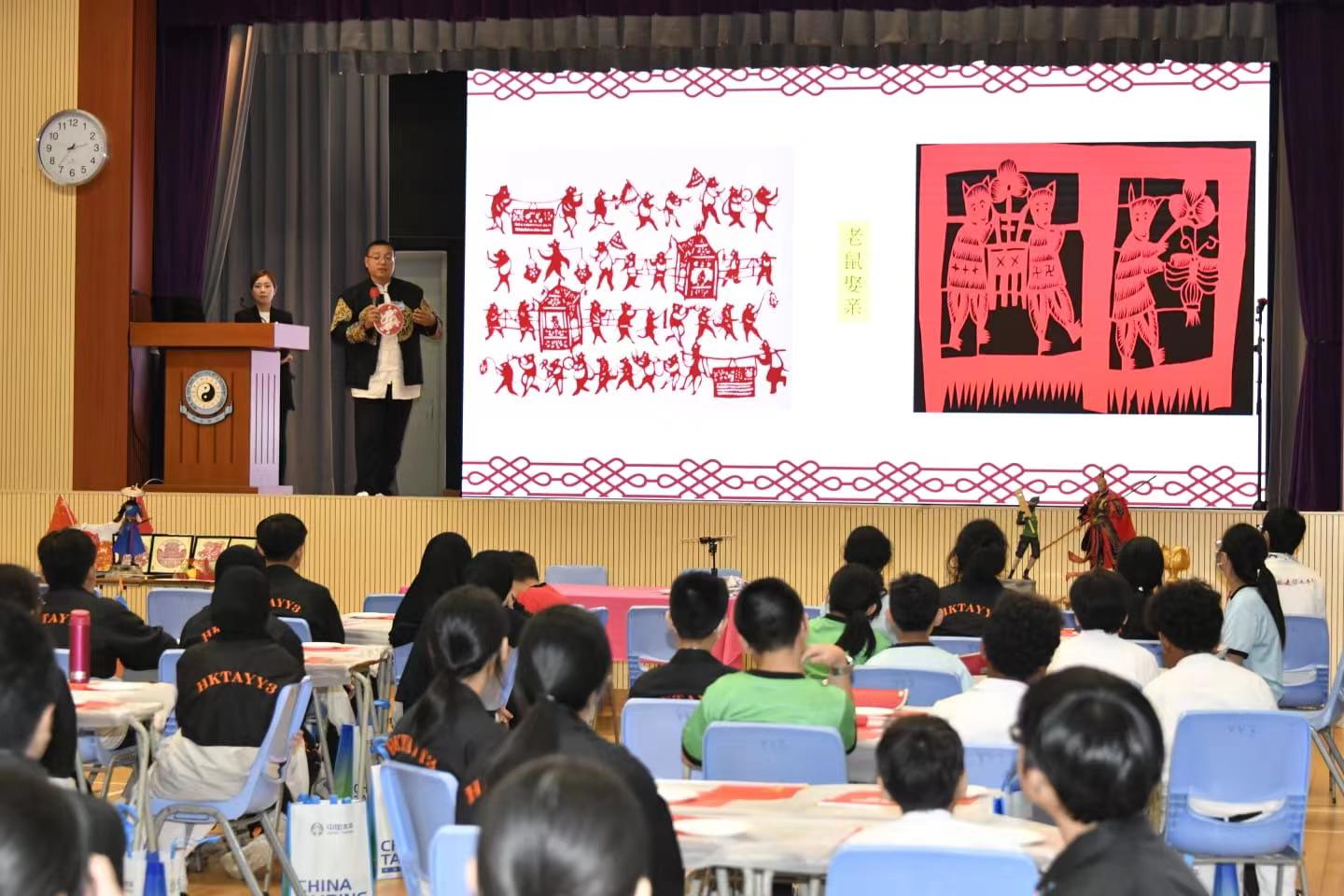 今日(24日)下午,慶祝中華人民共和國成立75周年之「非遺文化進校園·泉湧香江慶國慶」活動在香港道教聯合會圓玄學院第三中學舉行。濟南剪紙藝術院院長王濤、濟南麵塑協會會長駱遂應邀到港,向近百名學生分享我國非物質文化遺產的歷史文化內涵,並手把手傳授非遺技藝。