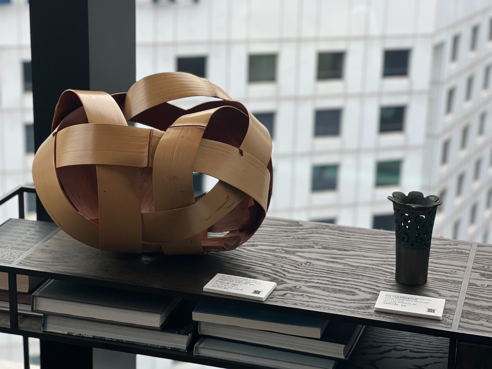 香港的土壤文創展示日本竹藝家松本破風作品《手鞠球形竹系列》,2020年。(左)香港的匯寶閣古美術展示《牛紋飾青銅香薰杯形器》(右),戰國。