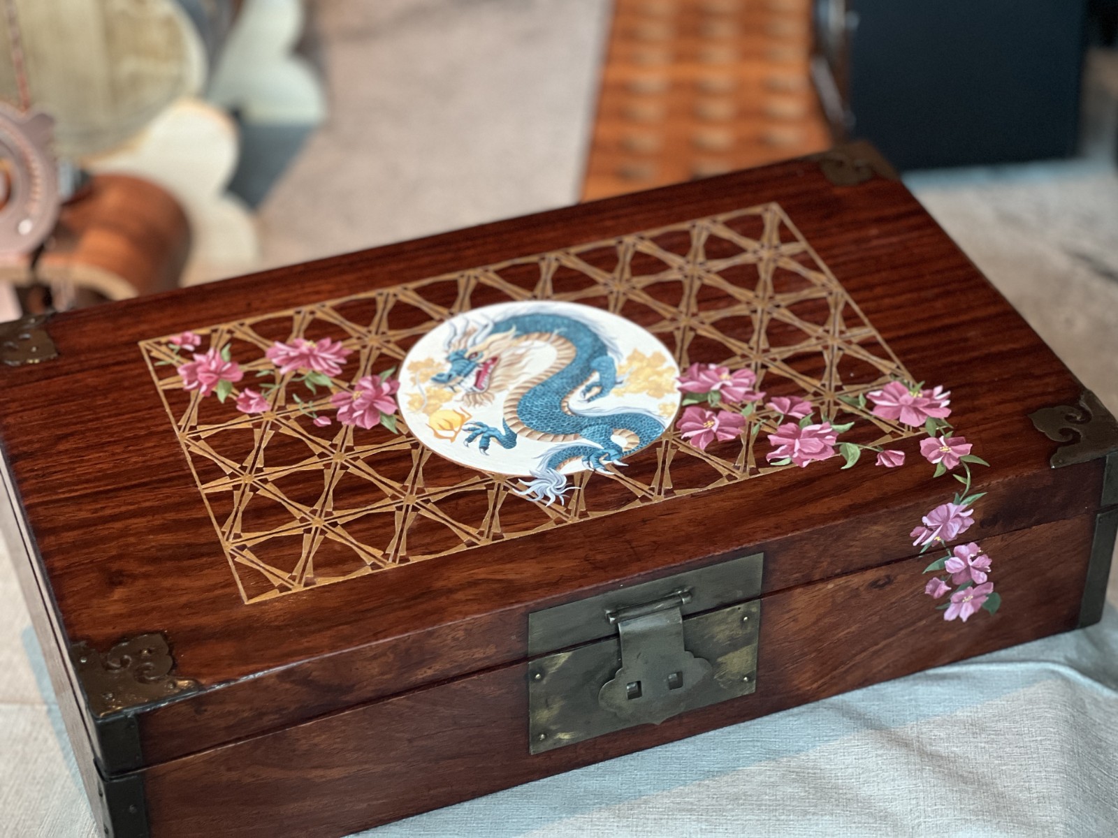 香港的匯寶閣古美術展示《黃花梨盒配以董文繪畫的龍戲火珠》,清朝。