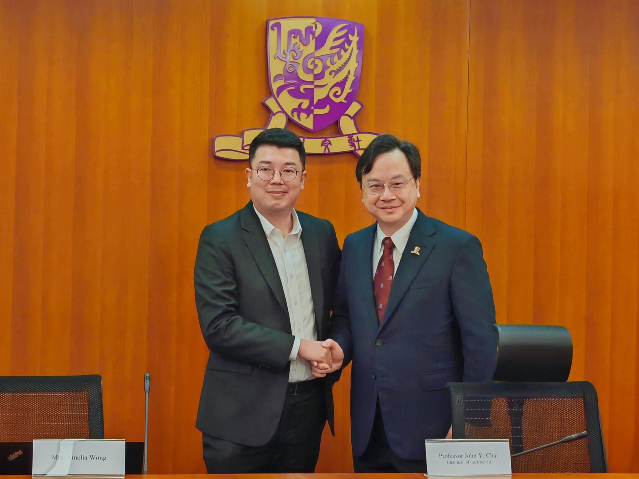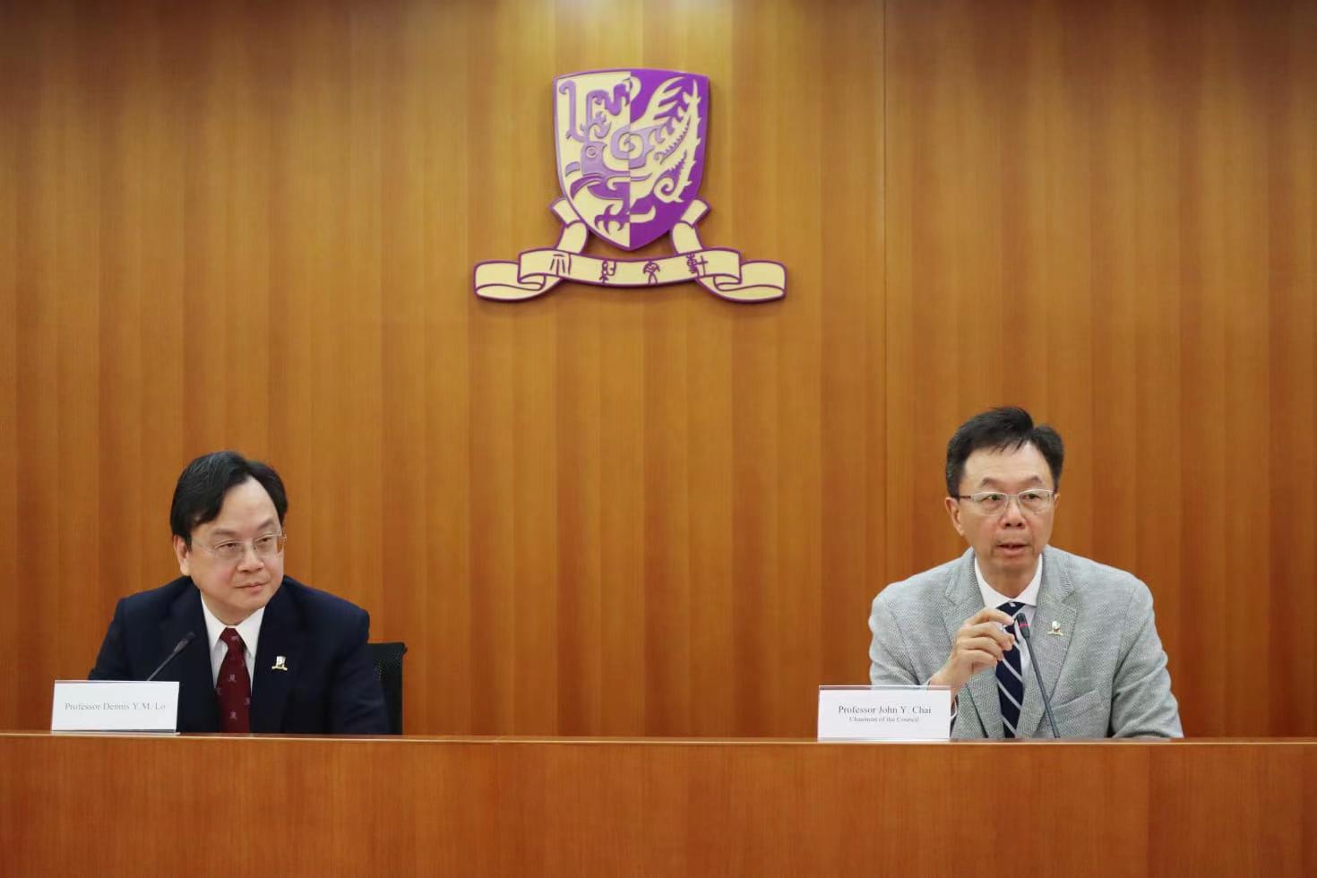 中大下任校長盧煜明(左)與中大校董會主席查逸超(右)。記者 馮瀚文攝