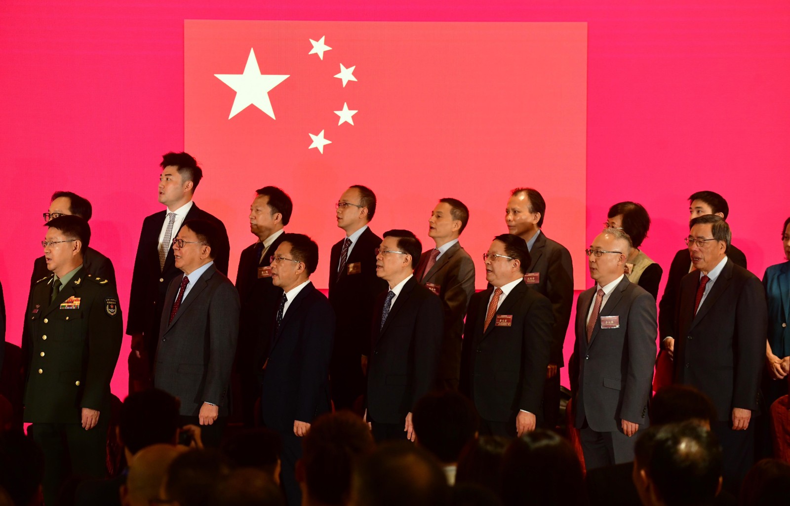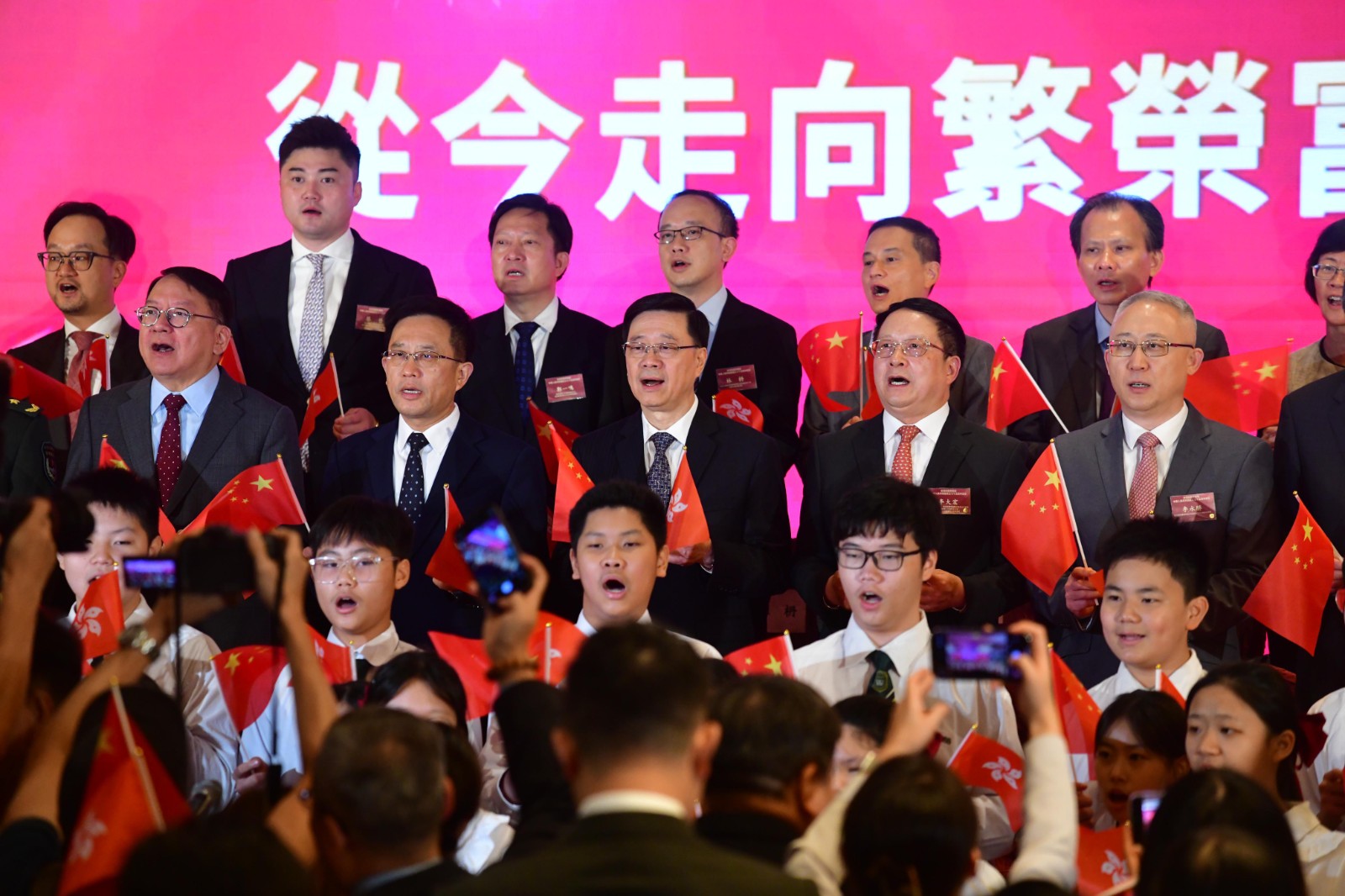 出席的其他主禮嘉賓還有中聯辦秘書長王松苗,政務司司長陳國基,外交部駐港特派員公署副特派員李永勝,駐港部隊副政委王兆兵,立法會主席梁君彥等,連同社會各界翹楚、新聞界同仁等嘉賓400多人聚首一堂。祝酒後,在香港教育工作者聯會黃楚標中學合唱團伴唱下,全場一齊揮舞國旗和區旗,齊唱《歌唱祖國》,把現場氣氛推向高潮。(記者:李銘欣 攝影:崔俊良)