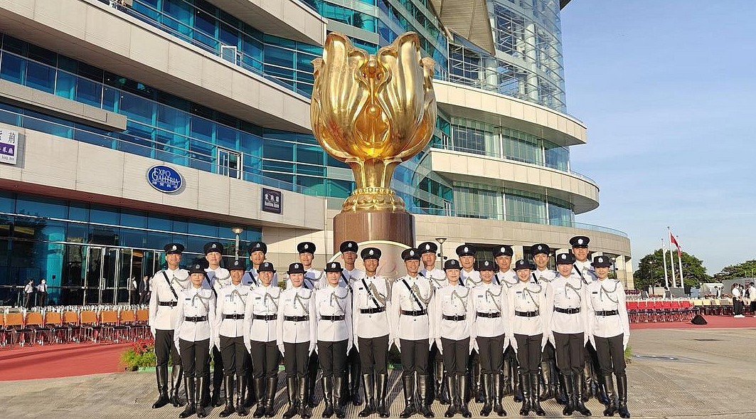 在隆重而莊嚴升旗儀式中,入境處儀仗隊與入境處青少年領袖團邁着堅定有力的步伐列隊進場,表達對祖國無限熱愛。隨着五星紅旗冉冉升起,現場全體人員面向國旗高唱國歌,大力弘揚愛國精神。(記者 區天海)