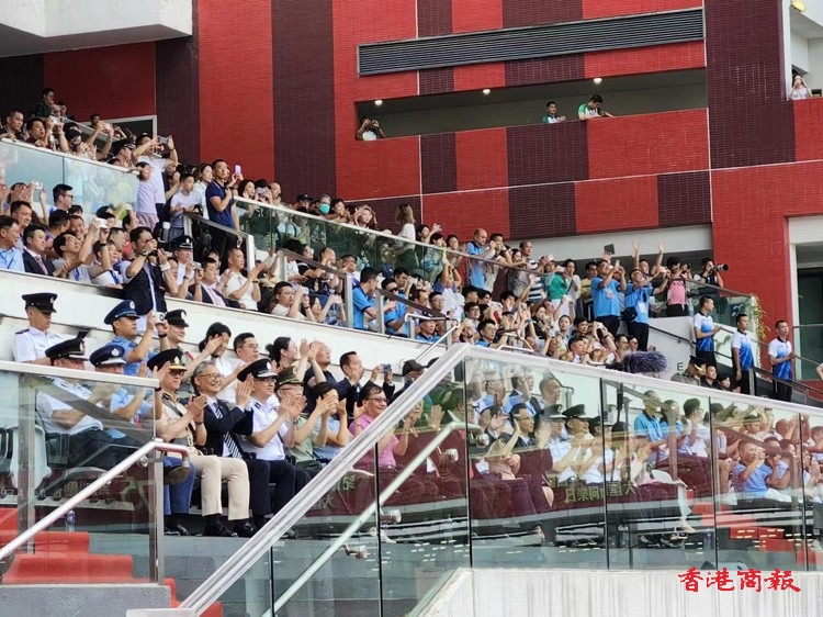 台上嘉賓鼓掌向台下參演的紀律部隊致意。(記者 葉家亨攝)