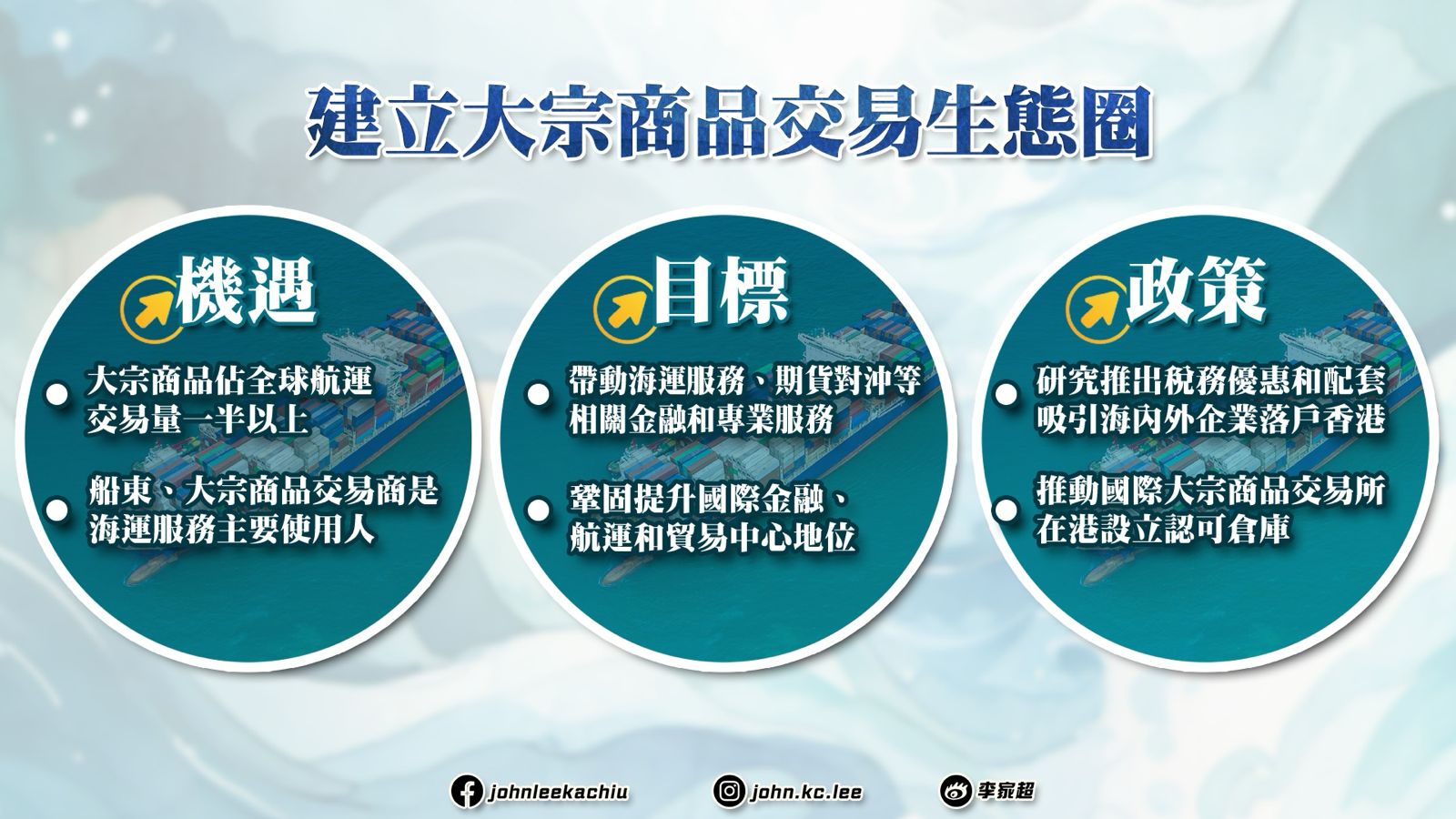 李家超說,金屬和礦產等大宗商品佔全球航運交易量一半以上。船東和大宗商品交易商是航線和海運服務的主要使用者,吸引他們集聚香港運作可帶動海運服務,並推動期貨對沖等金融和專業服務,有利鞏固提升香港國際金融、航運和貿易中心地位。政府會研究稅務優惠和配套,吸引相關海內外企業落戶香港,構建大宗商品交易生態圈。