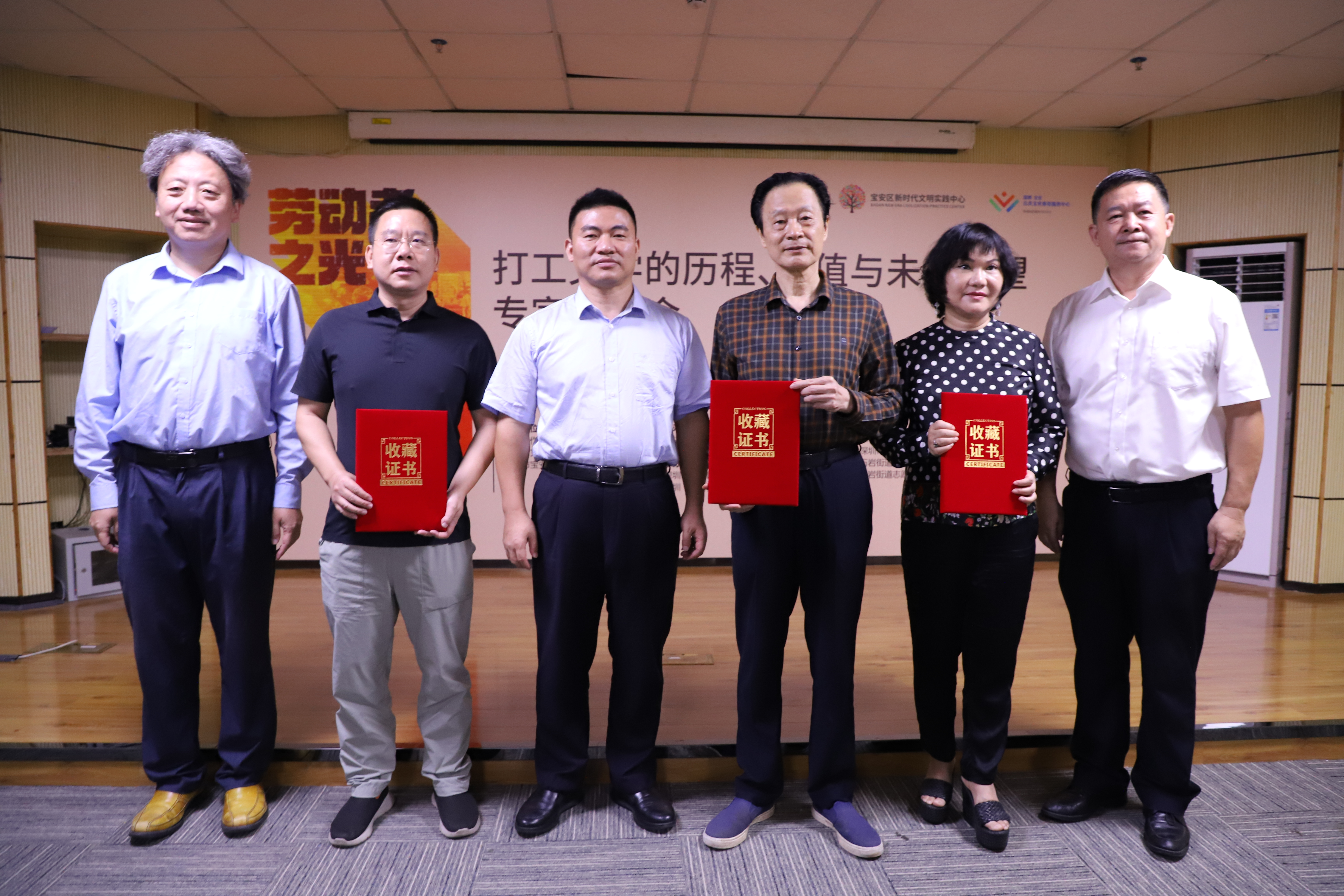 活動現場首次播放了「打工文學:勞動者之光」視頻。該視頻通過豐富的歷史影像資料,生動展現了打工文學從誕生之初到繁榮發展的全過程。隨後,現場舉行了捐贈儀式。打工文學首倡研究者、深圳市文聯原專職副主席楊宏海向深圳(寶安)勞務工博物館捐贈數百件打工文學見證物。在展覽籌備過程中,深圳(寶安)勞務工博物館面向社會各界徵集見證物,收到了許多熱心人士慷慨相贈。為了對這些熱心捐贈者表示由衷的敬意和感謝,活動現場主辦方為楊宏海、謝湘南、朱熳青等捐贈代表人頒發了收藏證書。