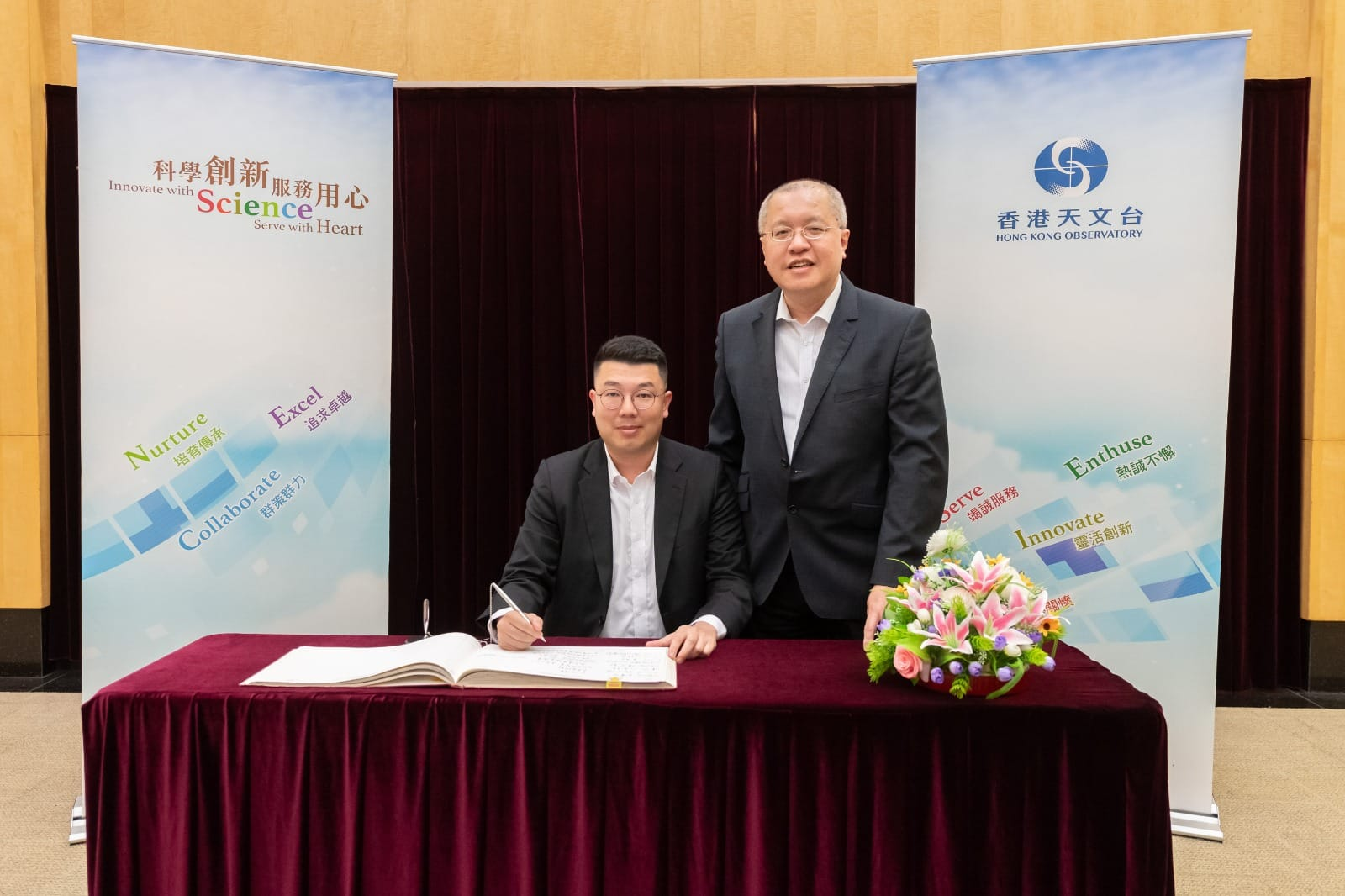 劉國勳還參觀天文台錄影室和歷史室,了解天氣預報製作過程、在惡劣天氣下作天氣預報的挑戰及天文台、天文科技的發展歷史等。他更與天文台台長陳栢緯及氣候變化專員黃傳輝就天氣預報準確度、應對極端天氣措施和氣象服務設施的擴展等議題交換意見。(圖片來源:劉國勳社交平台專頁)