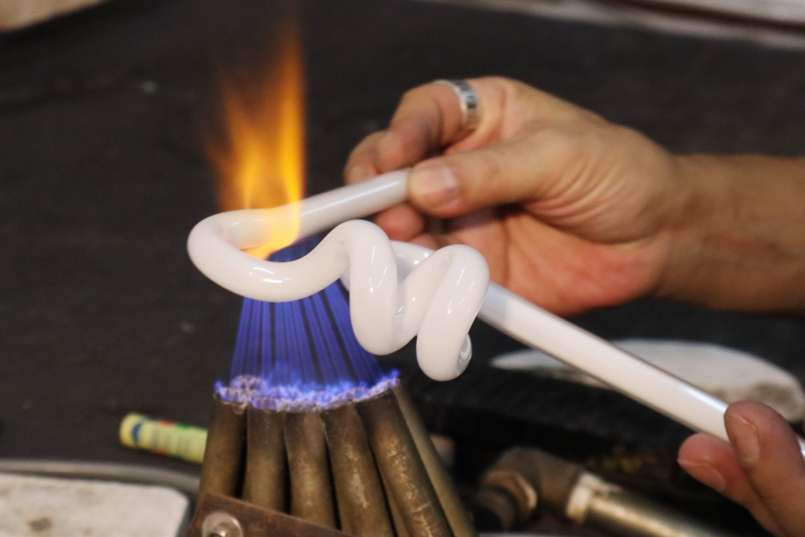 胡師傅指燒製光管時要手快眼快(上),當光管彎曲到理想的形狀時要立即吹氣(下),避免字形下陷不成形。 (圖:馮瀚文攝)