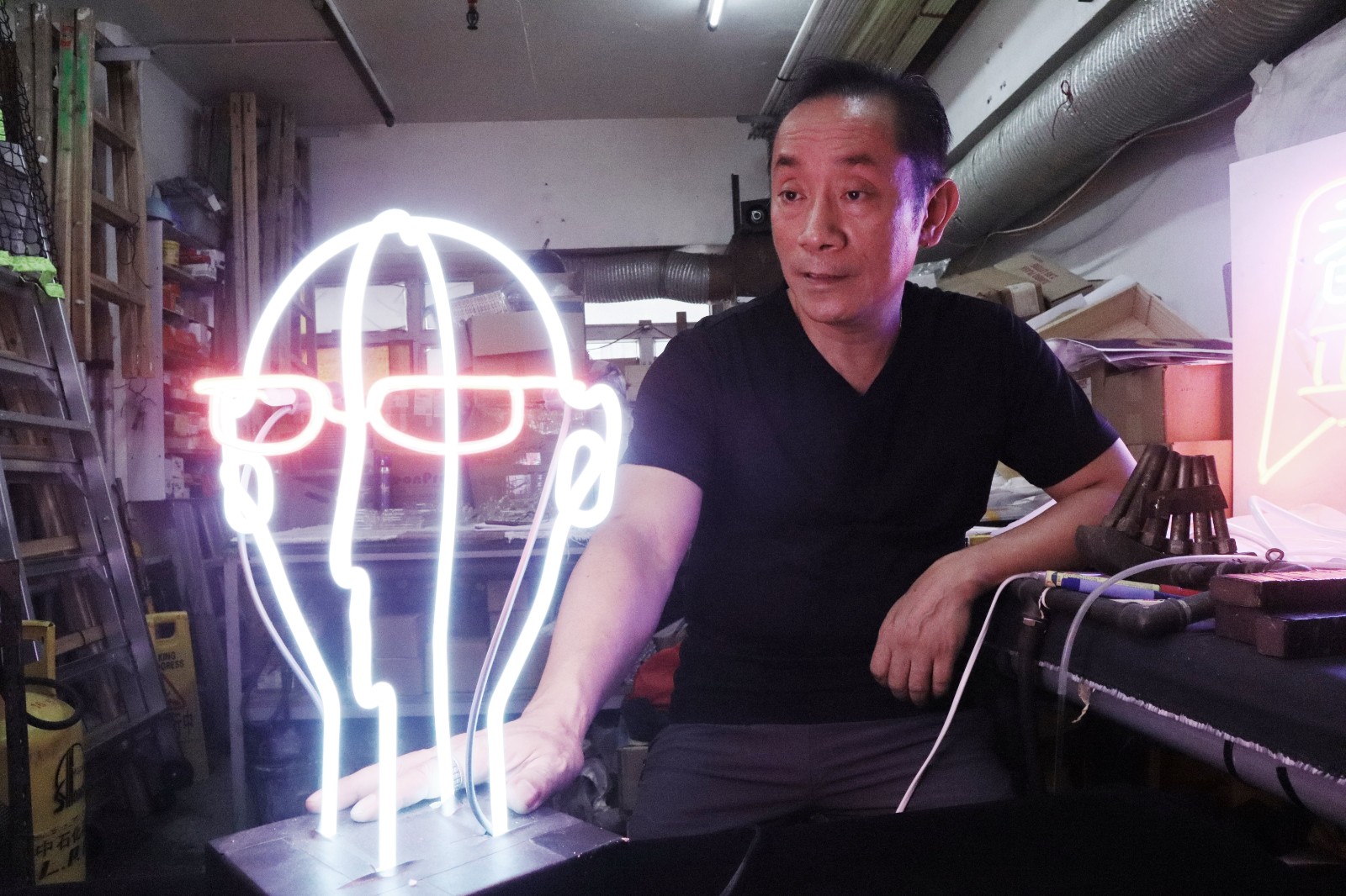 胡智楷早預感室內燈飾擺設是霓虹燈的發展出路,圖為他早年設計的眼鏡立體人像造型霓虹燈,甚有藝術意味。 (圖:馮瀚文攝)