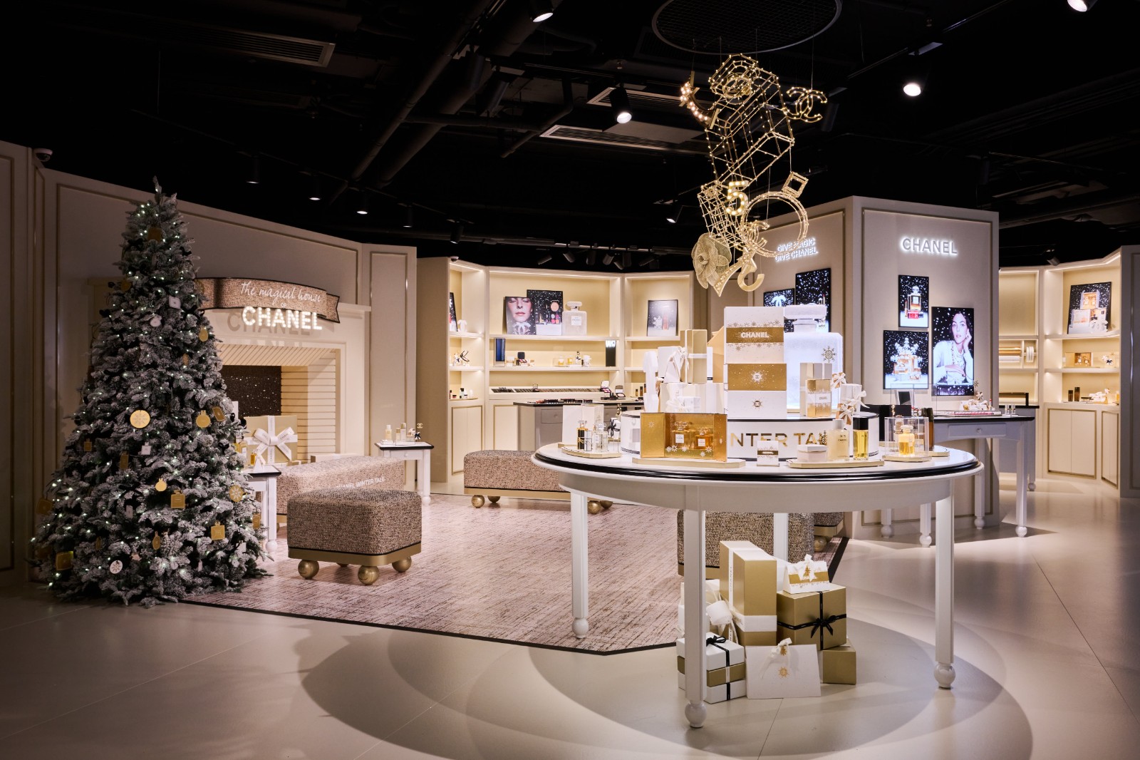 在香水美妝區,能感受品牌經典N°5香水,現場有專人為參觀者挑選合適的香水。最新的N°5 Purse Spray是一款可隨身攜帶的香水首飾鏈,管內是品牌香水N° 5 L’EAU Eau de Toilette或N°5 Eau de Parfum,首飾鏈上附設綴有品牌創始人Chanel女士的幸運數字「5」裝飾。產品可戴於腕間,配合製作場內限定的節日心意卡,是節日禮物的首選。節日限定N°5 EAU DE PARFUM的瓶身披上一重「冬雪」,由人手點綴於瓶肩,恍如灑上白色雪霜,為這款繁花香調添上新意。
