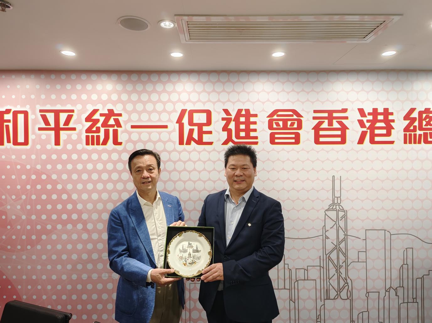 全國政協常委、香港統促總會會長姚志勝(左)向比利時統促會會長朱海安(右)致送紀念品。