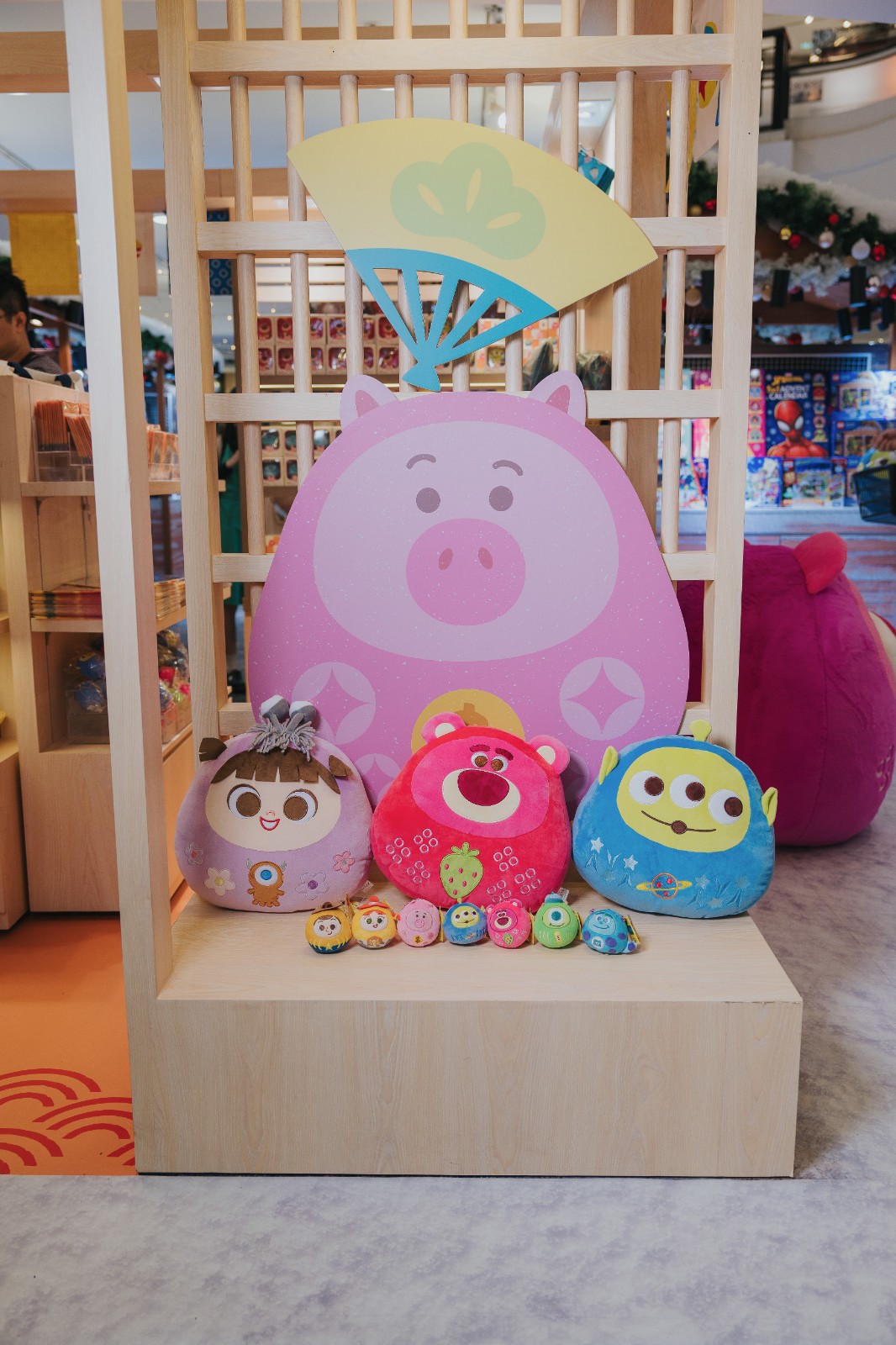 日本達摩被認為能夠實現祈願者的願望,不同色調的達摩蘊藏好運、歡欣及希望等祝福。是次推出的精品系列,以達摩造型為主題,包含《反斗奇兵》的三眼仔、勞蘇、胡迪、翠絲,及《怪獸公司》的阿Boo、大眼仔和毛毛,還有《熊抱青春記》的熊貓,共有9個不同角色化身成達摩造型。系列產品包括38cm的咕𠱸(HK$168)、達摩造型的減壓捏捏球吊飾(每款HK$68)和毛絨吊飾公仔(每款HK$88),還有文具及旅行用品。不論上班、上學或外遊,都可以帶着。購買迪士尼∙彼思達摩帆布袋(HK$188),並送同系列的達摩刺繡襟章3個,購買者可選擇喜歡的角色,自訂風格獨特的開運布袋。