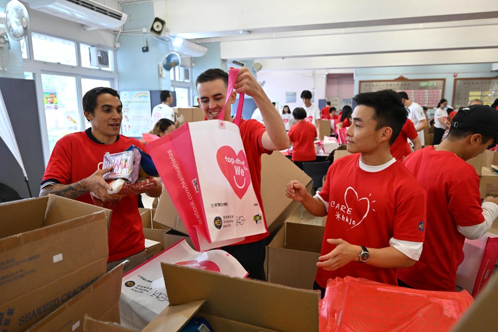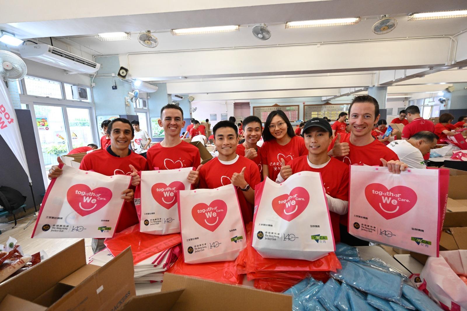 今年活動主題是「凝聚力量,溫暖社區」。馬會是活動的主要贊助機構,一眾馬會義工包括騎師董明朗、賀銘年、希威森、巫顯東、潘明輝、湯普新及楊明綸昨日(16日)到活動支持機構保良局雨川小學預備禮物包,為今早(17日)探訪作好準備。