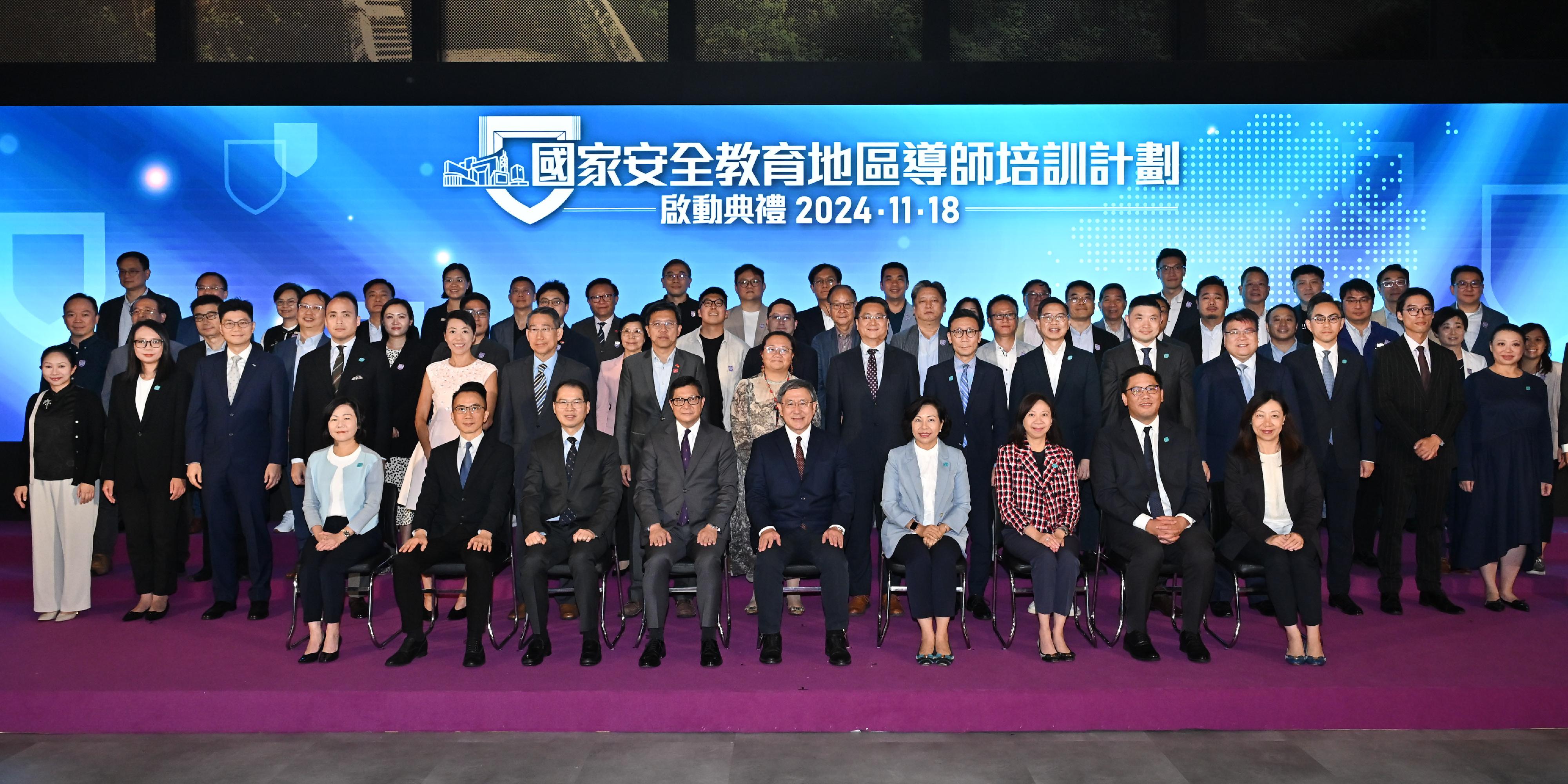(前排左四起)保安局局長鄧炳強、政務司副司長卓永興和民政及青年事務局局長麥美娟,與地區導師和其他嘉賓在典禮合照。政府新聞處