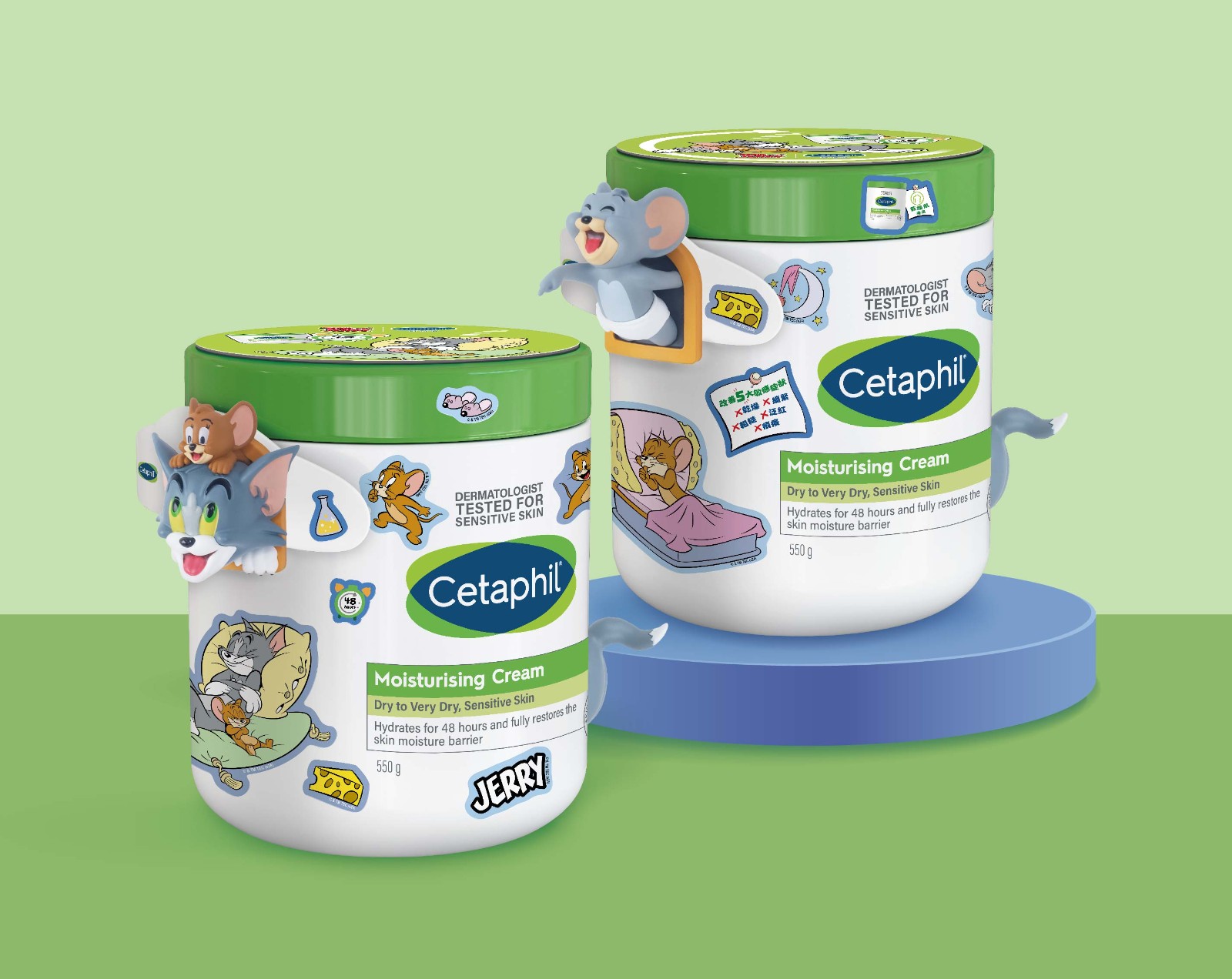 Cetaphil舒特膚與美國喜劇貓鼠冤家《Tom And Jerry》攜手推出無「乾」擾至好Sleep潤膚限量套裝,在質感如忌廉芝士般豐盈柔滑的潤膚膏上,重現主角經典的追捕場面。限量套裝分別推出4款具收藏價值的立體造型公仔連挖勺,可將公仔造型貼在潤膚膏的包裝罐上,重現卡通經典追捕場面,為日常護膚增添趣味。套裝同時附磁石貼和貼紙,在使用能為肌膚長效保濕效能的潤膚膏後,與卡通主角一齊無「乾」擾地睡在一起。