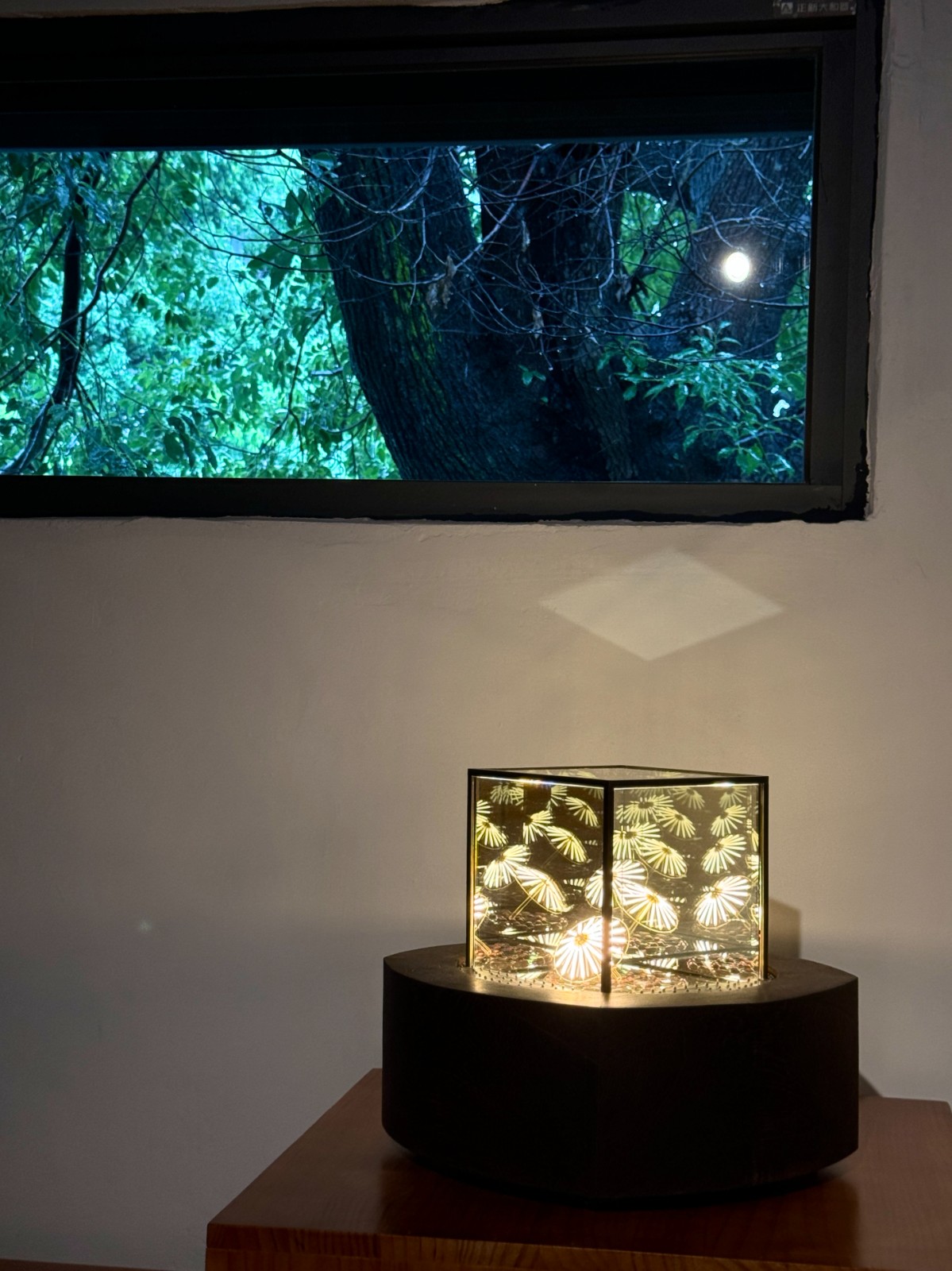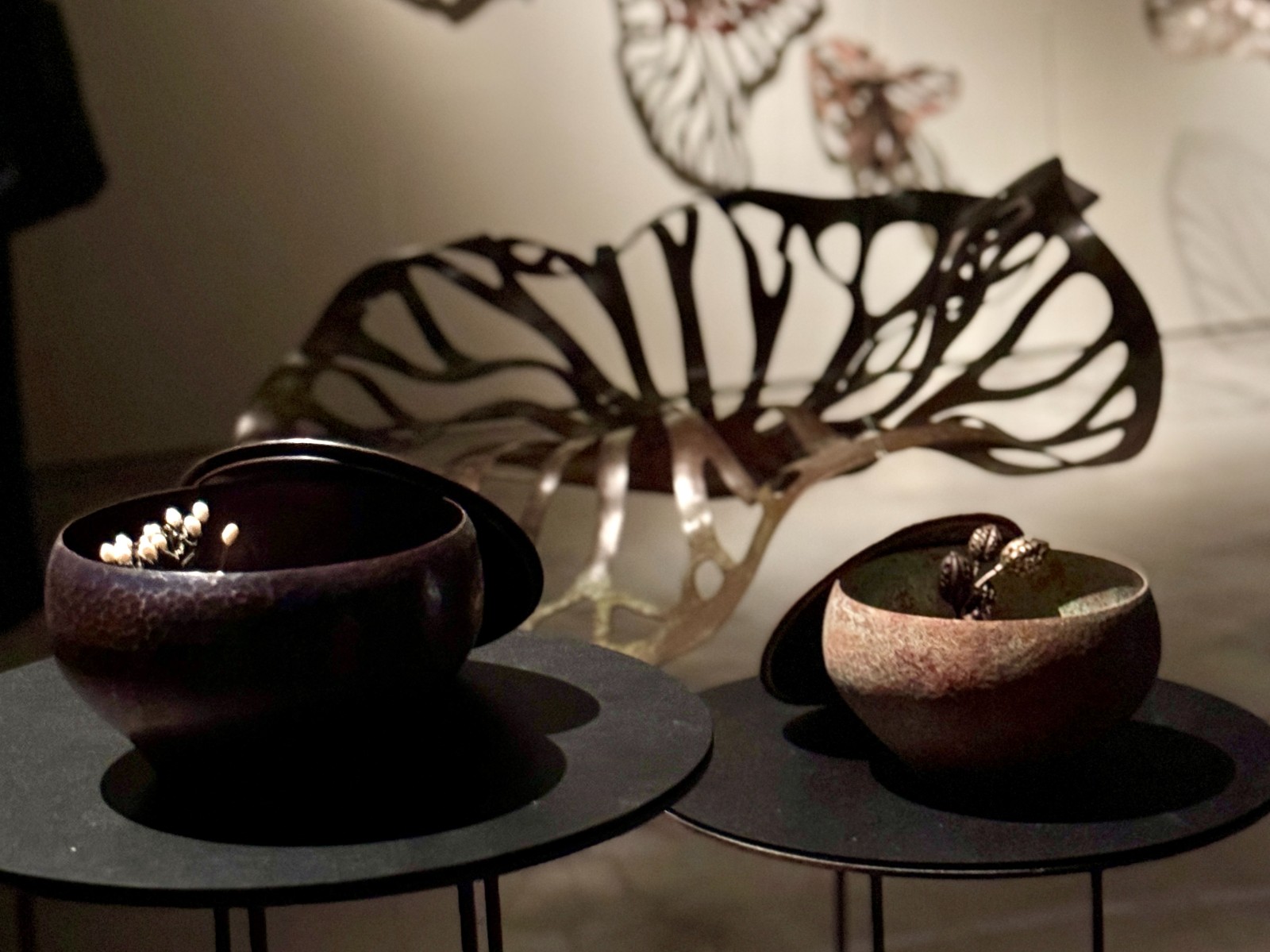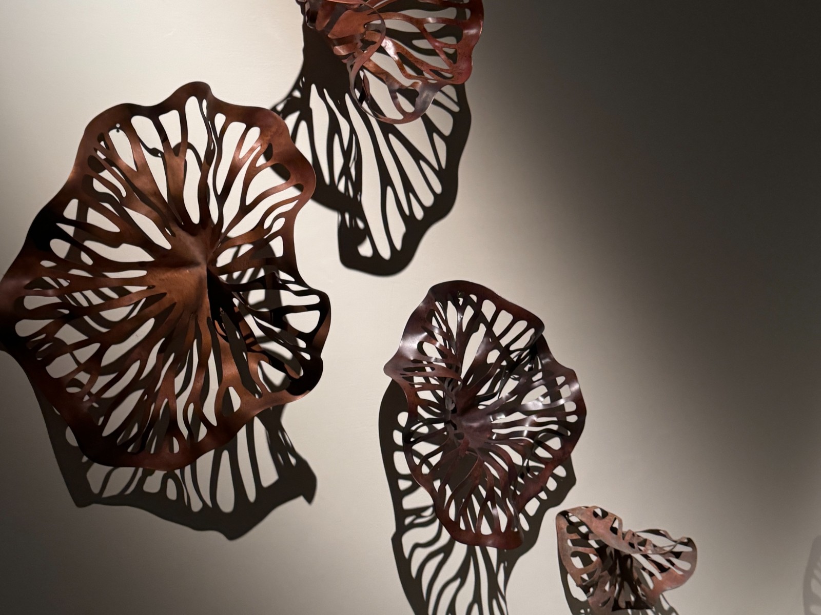 除了蔣勳的作品,藝術家曾永玲與董承濂也以自己的方式詮釋了《金剛經》中「諸相非相」的智慧。曾永玲的金工系列「蒔時一花一世界」以金屬打造出精緻的鉢,每一個鉢中都藏着一顆心,象徵善念的種子,隨着時間流轉而生長茁壯,最終開花結果。她的「葉影系列」則受池上大坡池的荷葉啟發,透過光影的變化表現出「諸相非相」的哲思,提醒人們萬物皆變,無常才是生命的本質。