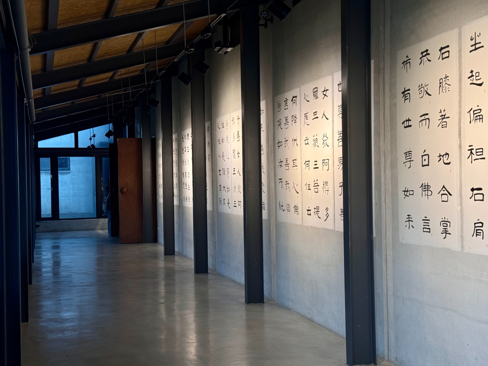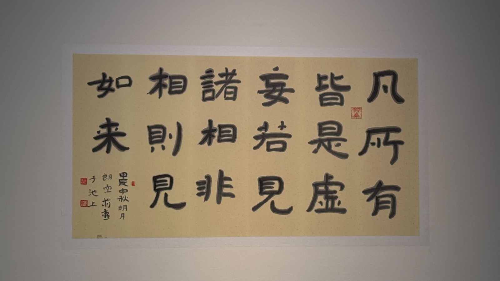 走進穀倉藝術館,可見長廊上懸掛蔣勳親手手抄的十八連幅《金剛經》,蔣勳說:「我有一個習慣,每天清晨時分靜心的抄寫幾張金剛經。」他分享,在百年前有人在泰山瀑布流過的山壁上手刻《金剛經》,而那些文字遲早會消磨殆盡。「我在紙上寫字,比起在石頭上刻字容易太多了。如果我還計較它有一天會不會存在,那大概是完全不懂《金剛經》。」這些書法作品,整齊裱貼於長廊牆面,字跡間流露出他多年來對《金剛經》的細膩感悟。觀者步入這條長廊,伴隨蔣勳朗讀的金剛經,彷彿走進經文的世界,隨着每一步的移動,內心漸漸沉澱,煩囂散去,直至沉浸此間。