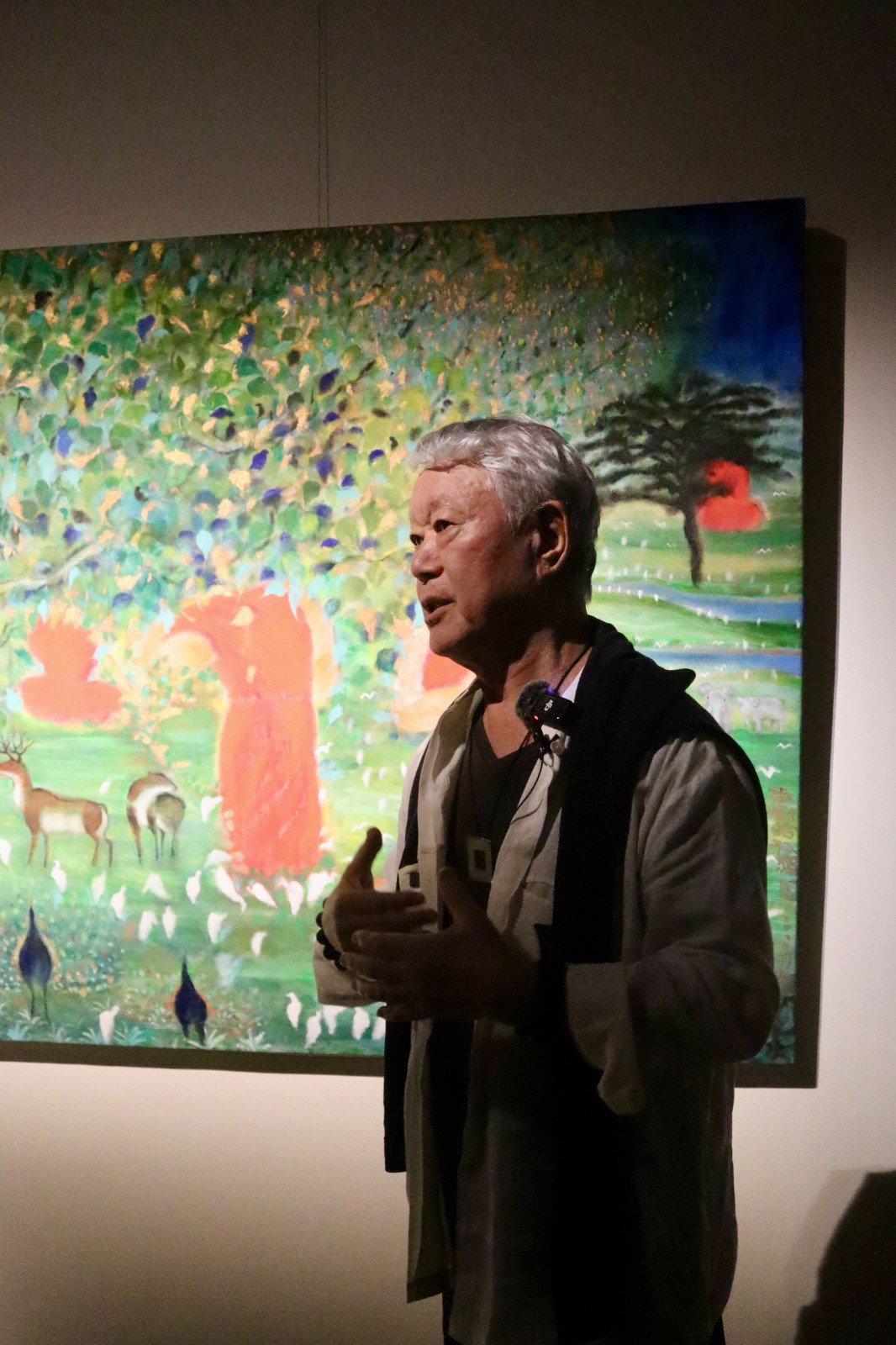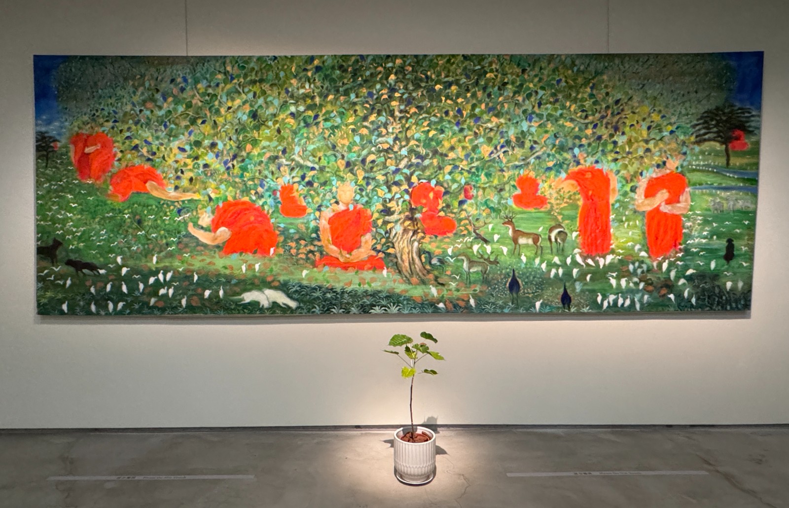 轉過長廊,蔣勳的油畫作品《祈樹給孤獨園》吸引了筆者目光。蔣勳說,池上讓他聯想到經文中的「祈樹給孤獨園」,那是一個供養善意、沉思自省的場所,而現在的池上,正如孤獨園一般,充滿靈性與安定。他以柔和的筆觸描繪出心中的孤獨園:紅衣修行者在森林中靜坐,伴隨百鳥靈鹿,萬物眾生,捕捉其間光影、聲音與時間的流轉。