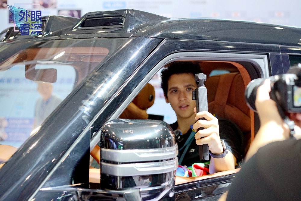 在這裏,可編程操控的無人機成為學生的課堂學習同伴,綠色清潔能源的電動車又拓展了無人駕駛技能。第一次參加高交會的阿曼友人Nasser也欣然接受Chico的邀請,坐進電動車駕駛室一同感受撲面而來的「未來感」。