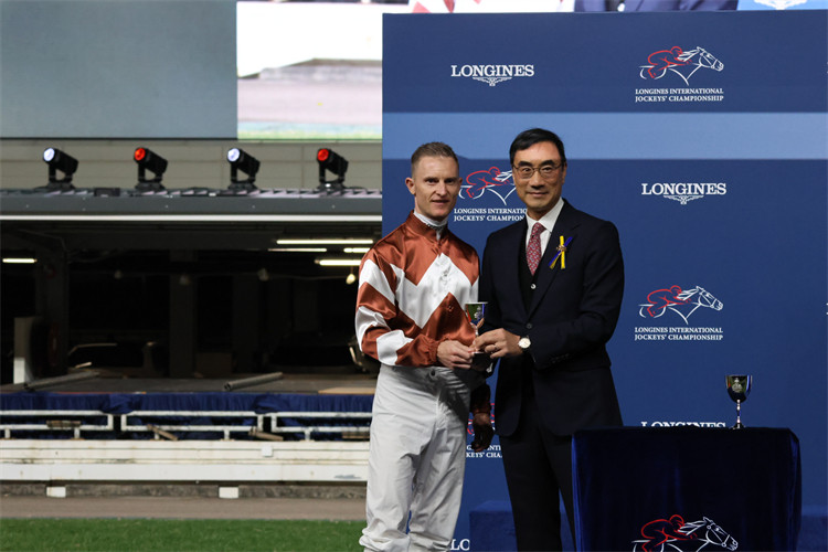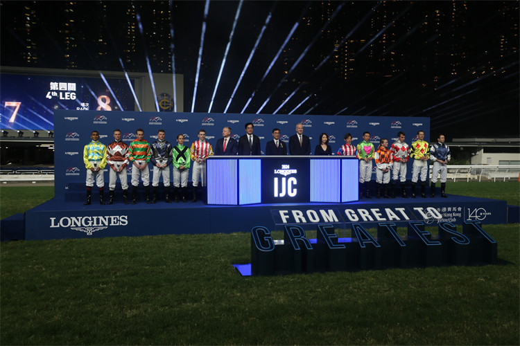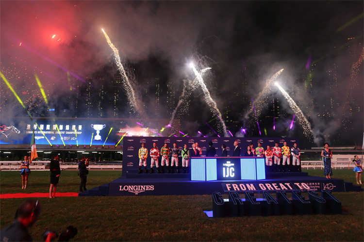 浪琴國際騎師錦標賽周三晚 (4日)在跑馬地馬場隆重上演,香港特別行政區財政司副司長黃偉綸、馬會行政總裁應家柏、馬會主席利子厚、浪琴行政總監Matthias Breschan及浪琴香港澳門區副總裁郭靖心,聯同12位參賽騎師何澤堯、簡國能、杜苑欣、金美琪、布宜學、莫雅、麥道朗、潘頓、布文、田泰安、川田將雅、以及巴米高,一起主持賽事開幕式。馬會主席利子厚頒發銀杯予12位參賽騎師後,隨即有煙火匯演為開幕式增添熱鬧氣氛。跑馬地馬場全晚入場人數逾2萬人,場面非常熱鬧。全晚投注額為14.45億元,較上年升6.9%,可謂旺丁又旺財。(文、圖、片:志誠)
