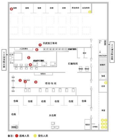 事發區域位於1號樓四層。燊榮公司在此設有倉庫、噴砂車間、打磨車間和食堂,四層最北側為天武金屬公司的閒置加工車間和宿舍。