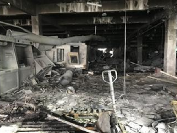 54分36秒,6號和3號五軸打磨機後部及內部發生爆燃。期間,打磨車間西側人工打磨區域上部產生大量煙霧。