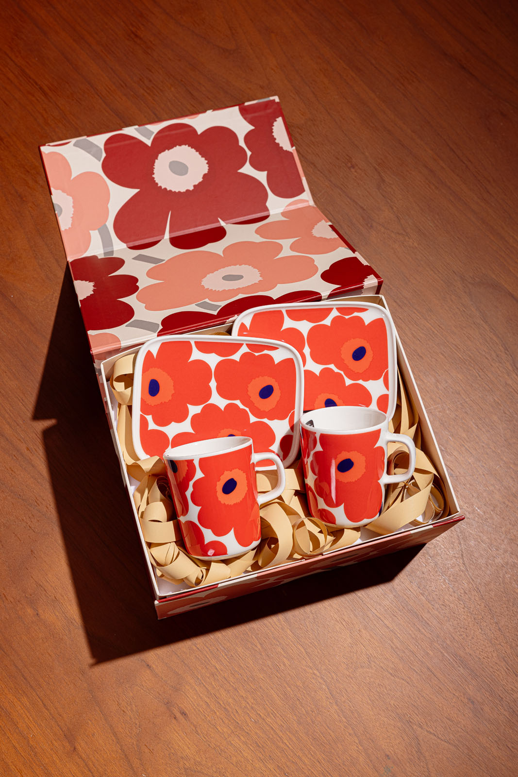 玩味十足的印花家品能令提升家居的佳節氛圍,Marimekko今年推出節日限定禮盒套裝,外包裝以紅色的標誌性UNIKKO印花為主題,內有一對印花馬克杯和碟子套裝,並設6款UNIKKO印花及1款KUUSIKOSSA聖誕樹印花可供選擇,隨盒限量附送印花玻璃飲管套裝,助布置充滿節日感的餐桌擺設。