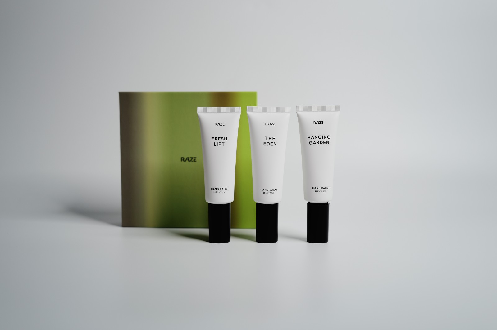 RAZE推出兩款全新香氣Drive in Ashes與Arctic Bulle,新香氣融入水基底香水、香氛蠟燭和室內擴香。品牌的生活香氛產品類別,新增了車用香氛座、身體磨砂和護手霜系列,把詩意芳香融入生活中,並提供11款節日禮品組合套裝。其中護手霜套裝適合冬日,純素配方針對手部肌膚調配,蘊含2%維生素原B5、乳木果油、甜杏仁油、金盞花萃取物等,可長效保濕和修復受損肌膚。