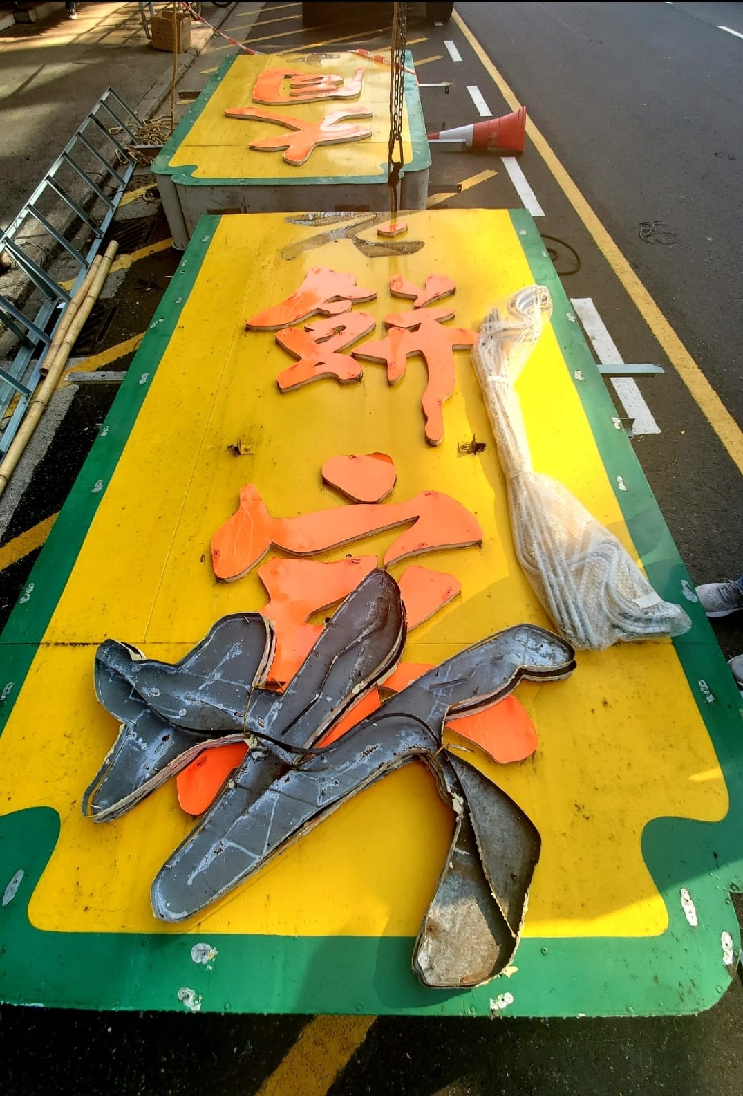 拆卸招牌時不是每塊均能完整卸下,有時需要將招牌燈箱拆開,如上圖的「大同老餅家」。(Cardin Chan提供)