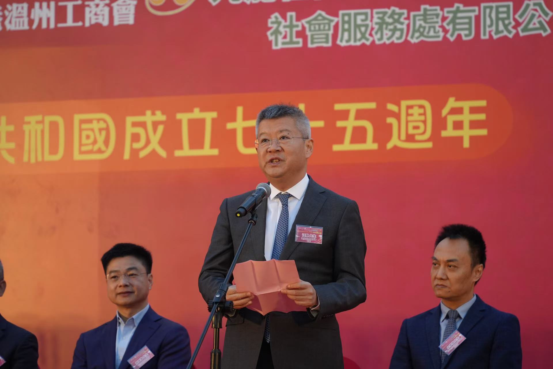 汪馳在致辭時表示,七十五年來,新中國歷經風雨洗禮,砥礪前行,取得了舉世矚目的偉大成就。香港了積極而獨特的作用,為國家的改革開放和現代化建設作出了重要貢獻。他強調,香港同胞自回歸以來,以前所未有的主人翁精神,積極參與社會事務管理,保持了香港的繁榮穩定,彰顯了「一國兩制」偉大實踐的光榮與正確。香港溫州同鄉會作為聯繫和推動溫港兩地交流的橋樑和紐帶,一直秉持「愛國愛港、凝聚鄉情、回饋社群」的宗旨,推動溫港兩地攜手合作、互利共贏。