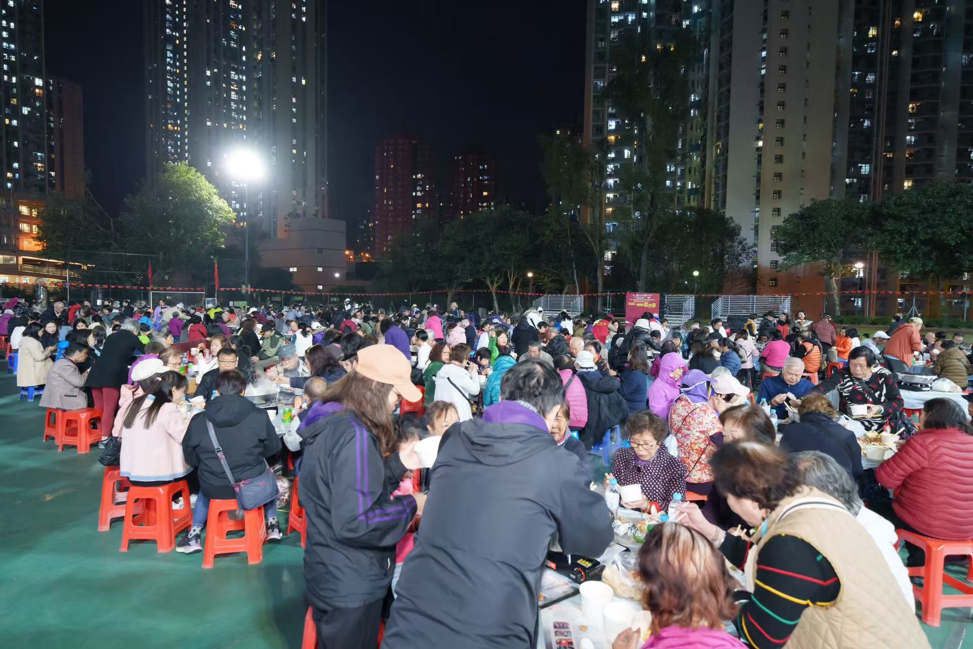 由香港溫州同鄉會、香港溫州工商會與九龍社團聯會觀塘地區委員會聯合主辦的「慶祝中華人民共和國成立75周年享繁榮齊迎新」千人盆菜歡樂宴日前在藍田配水庫籃球場舉行。活動還得到觀塘民政事務處、觀塘區景田關愛隊、觀塘區議會國民教育推廣委員會、粵港澳溫籍社團的大力支持,觀塘區30多位區議員、20多支關愛隊代表、友好社團代表及市民近2000人參與活動。