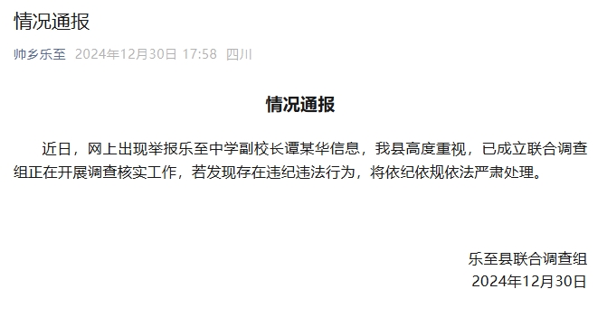 中共樂至縣委宣傳部官方微信公眾號「帥鄉樂至」30日發布情況通報稱,近日,網上出現舉報四川資陽樂至中學副校長譚某華信息,樂至縣高度重視,已成立聯合調查組正在開展調查核實工作,若發現存在違紀違法行為,將依紀依規依法嚴肅處理。