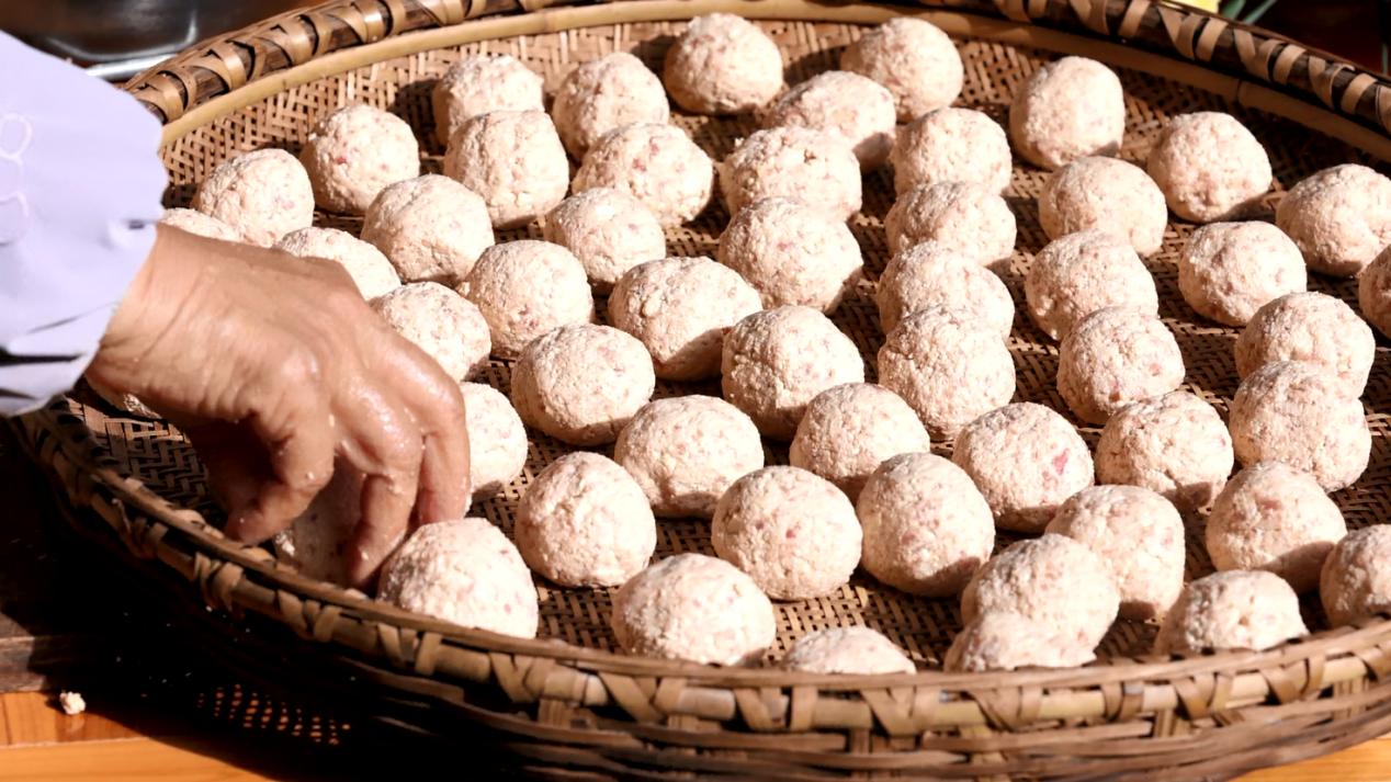 豆腐作為大江南北都喜愛的傳統食材,經常被做成不同的美味,而最有年味的吃法莫過於做成豆腐圓子。村民們將土豬肉餡與剛剛做好的豆腐均勻混合,充分攪拌成餡後,再用手輕輕地搓揉成圓滾滾的丸子。隨後,放入60度左右的油鍋中文火煎炸,不一會兒,外表金黃、香氣四溢的豆腐圓子便新鮮出爐了。