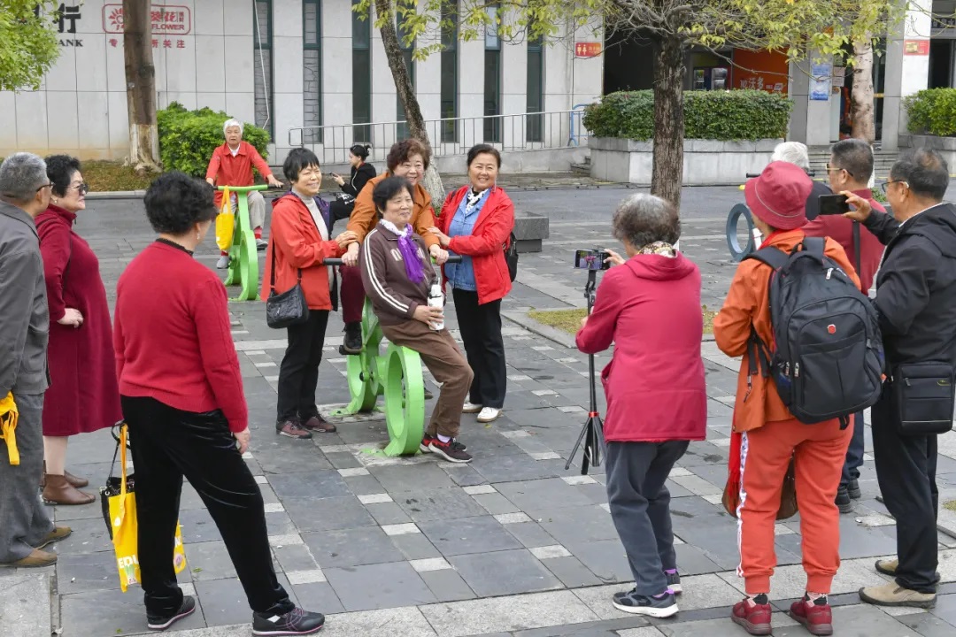 「快來幫我拍照,我是10多年沒有騎過自行車了!」「來,我們都拍拍照片,多精神啊」……在長安體育公園南門廣場入口的健身器材區域,老人們正在開心地騎着「自行車」,他們賣力和興奮的勁頭,就像小孩子一般,有些老人運動完後還為正在鍛煉的老人拍起照來,有擺弄着各種姿勢的,有單人照、多人合照,還有各種聊天,現場氣氛熱鬧,每個老人的臉上都洋溢着笑容。