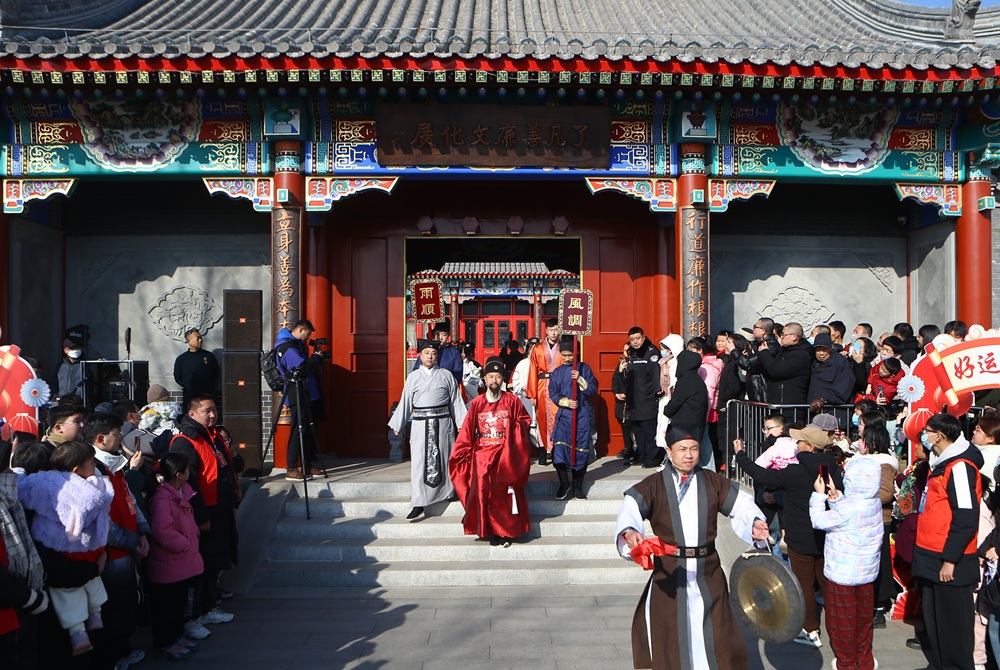 投壺、捶丸、射箭等國風遊樂活動和飛花令互動活動,吸引遊客自發排起長隊,體驗參與、一試身手。舞龍、舞獅、高蹺、小車會等精彩的花會展演在慕賢廣場相繼亮相,怡杏軒里評劇、京東大鼓等非遺表演引得遊客駐足圍觀,宣化閣內新開闢的廟會小劇場,皮影、變臉、魔術活動既富有傳統文化韻味,又洋溢着生活氣息,表演至精彩處,現場觀眾紛紛拍手稱好。