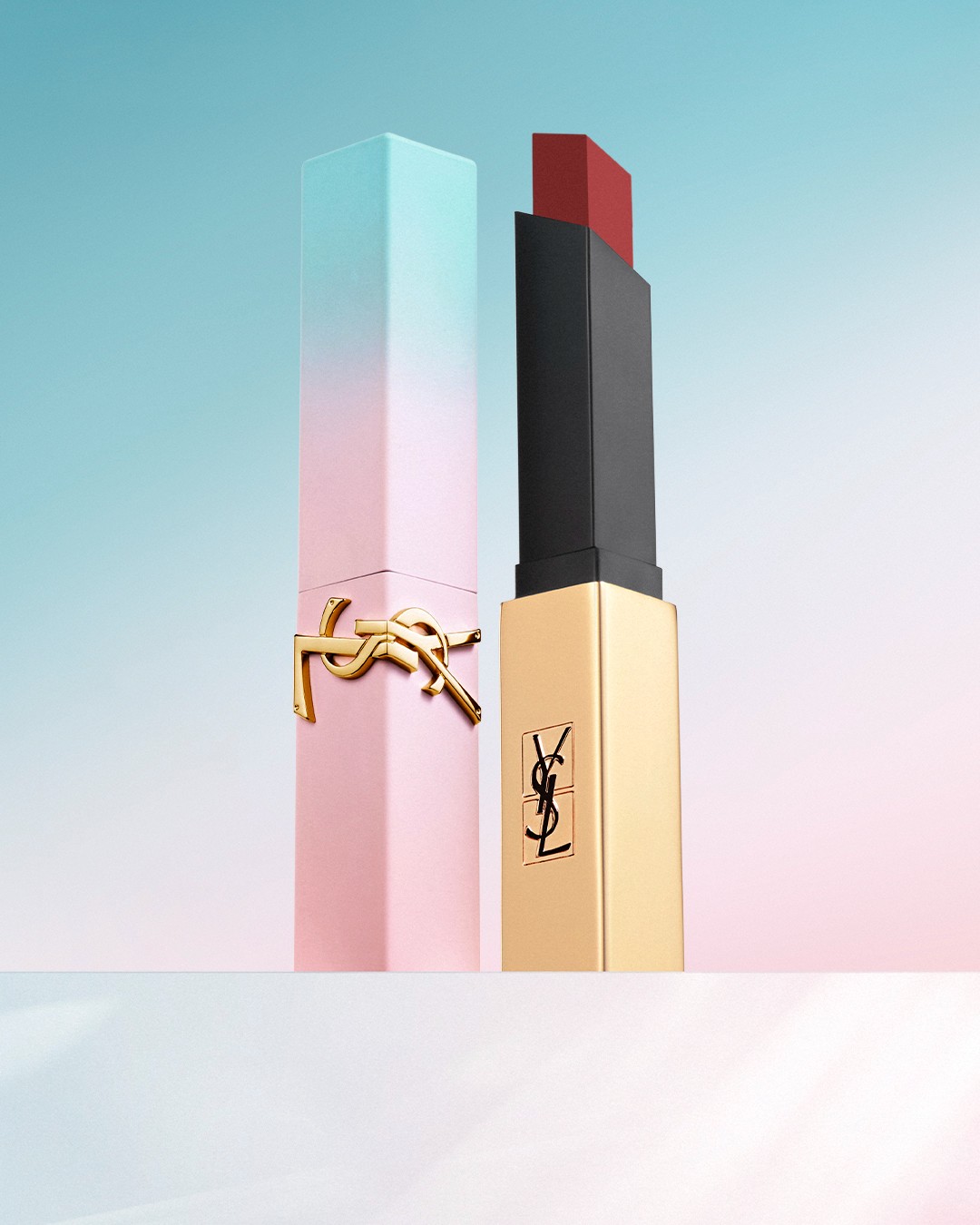 YSL Beauty推出限量版美妝情人節系列,創作靈感來自品牌高訂時裝設計,每款美妝品的內外包裝設計展現天藍與柔粉色調交織出清新漸變層次,象徵日出日落,永不止息的愛意。絕色輕霧唇膏N1966為雙唇披上熱情復古棕紅色調,啞光質地,輕柔觸感。包裝設計以藍粉色調搭配品牌金色標誌,經典華麗。明彩輕透亮肌氣墊粉底以奢華皮革設計呈現B10與 BR20兩款熱門色調,外殼以藍粉漸層搭配金色標誌,是珍藏之選。