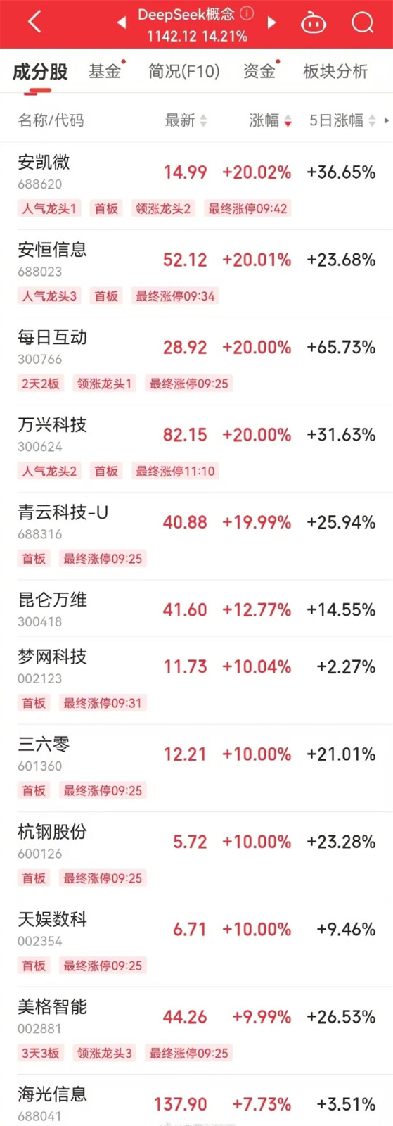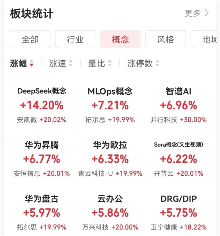 2月5日,DeepSeek概念股集體大漲,安凱微、安恆信息、每日互動、萬興科技、青雲科技-U、夢網科技、三六零、杭鋼股份、天娛數科等相關個股漲停。另外,MLOps概念、智譜AI等概念板塊亦漲幅居前。
